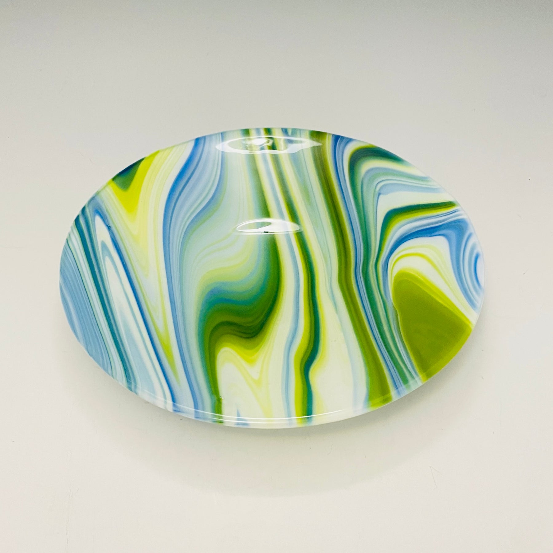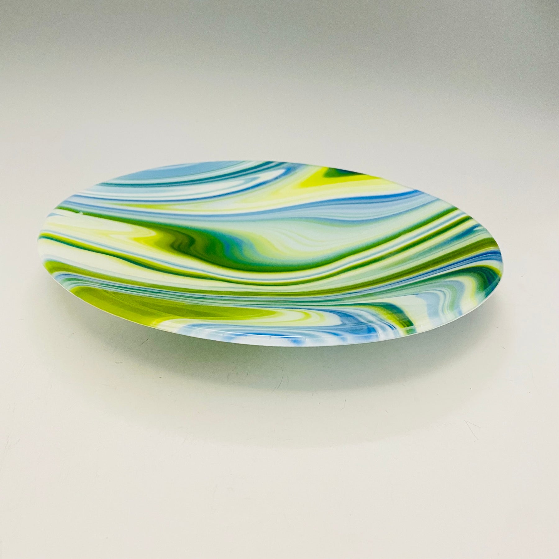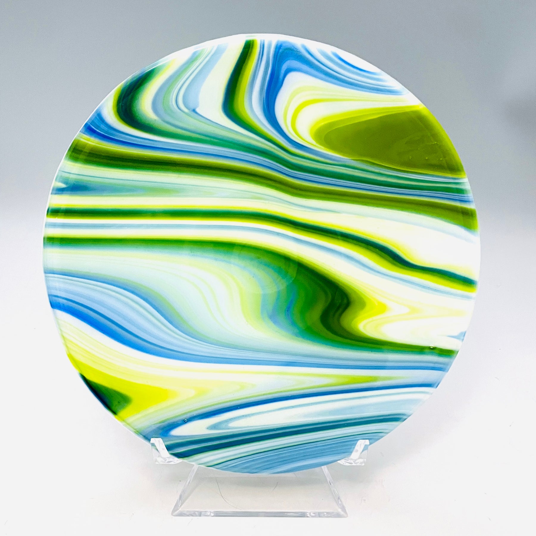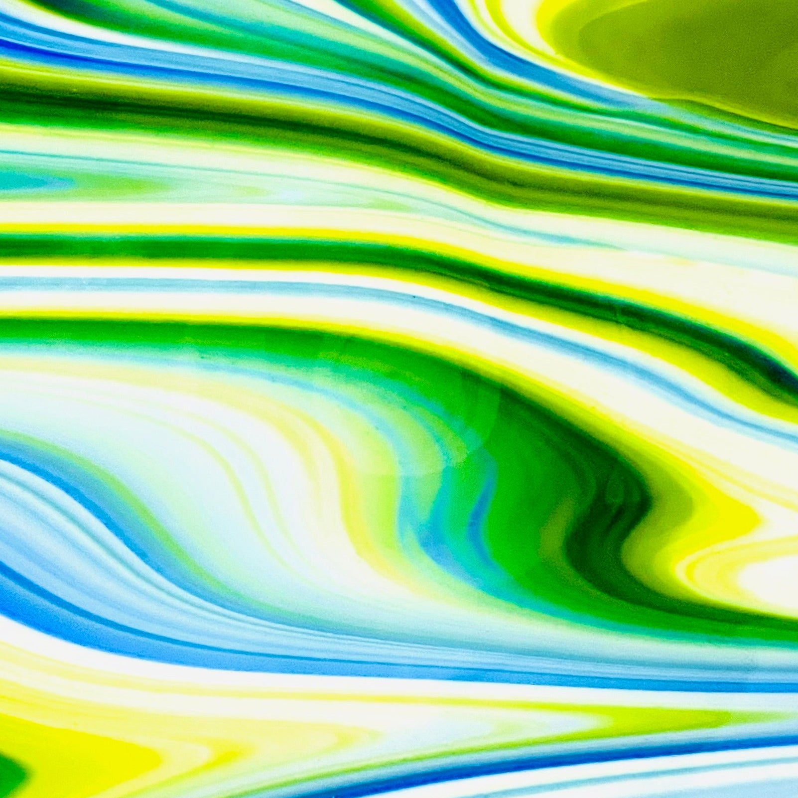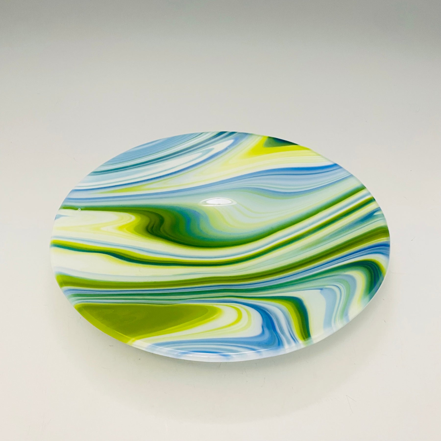 Artistic Process: It is made of hand cut glass in a layout to create a flow and pattern for a full fuse with a proper anneal. It was then kilnformed to shape into an large bowl in a final firing in the kiln.
