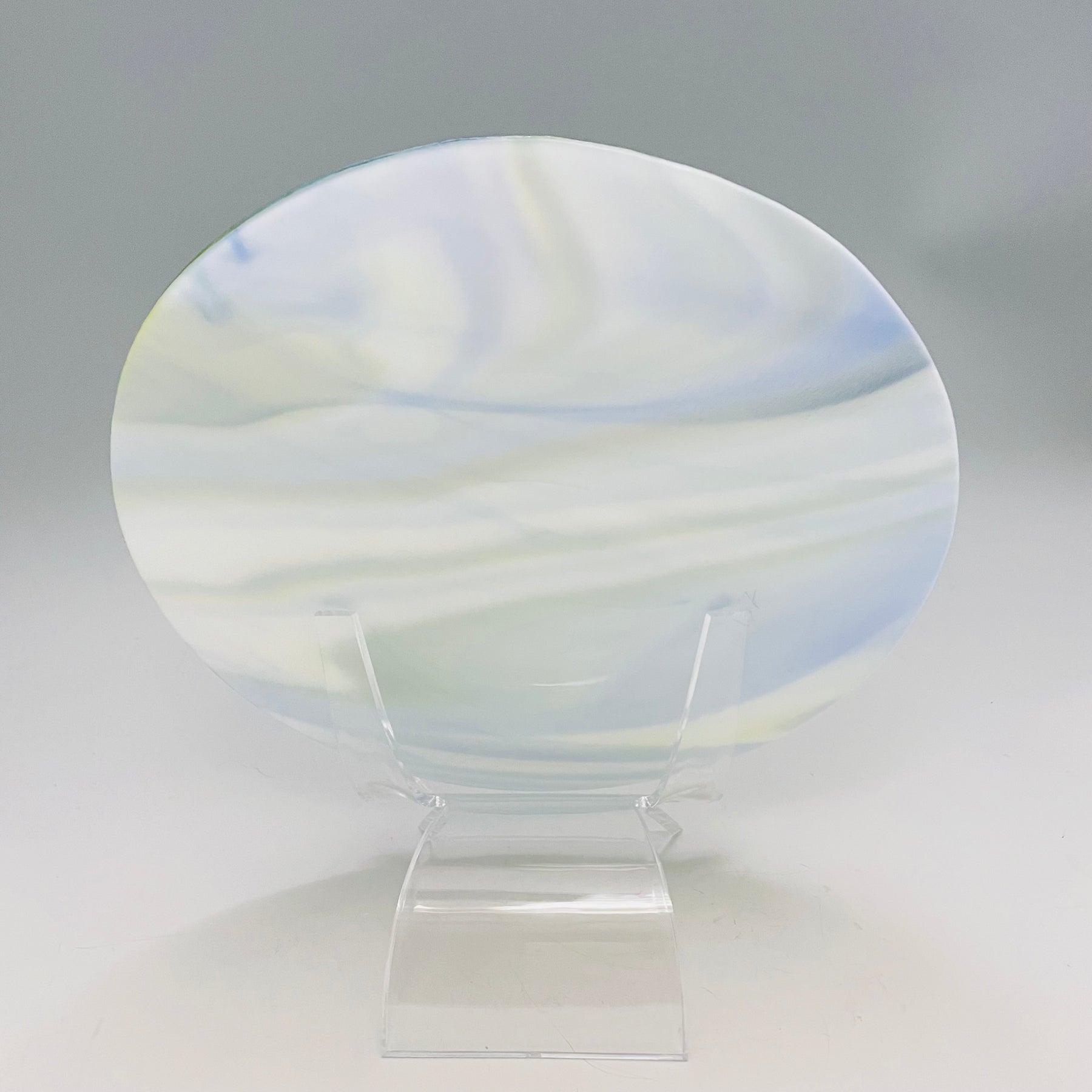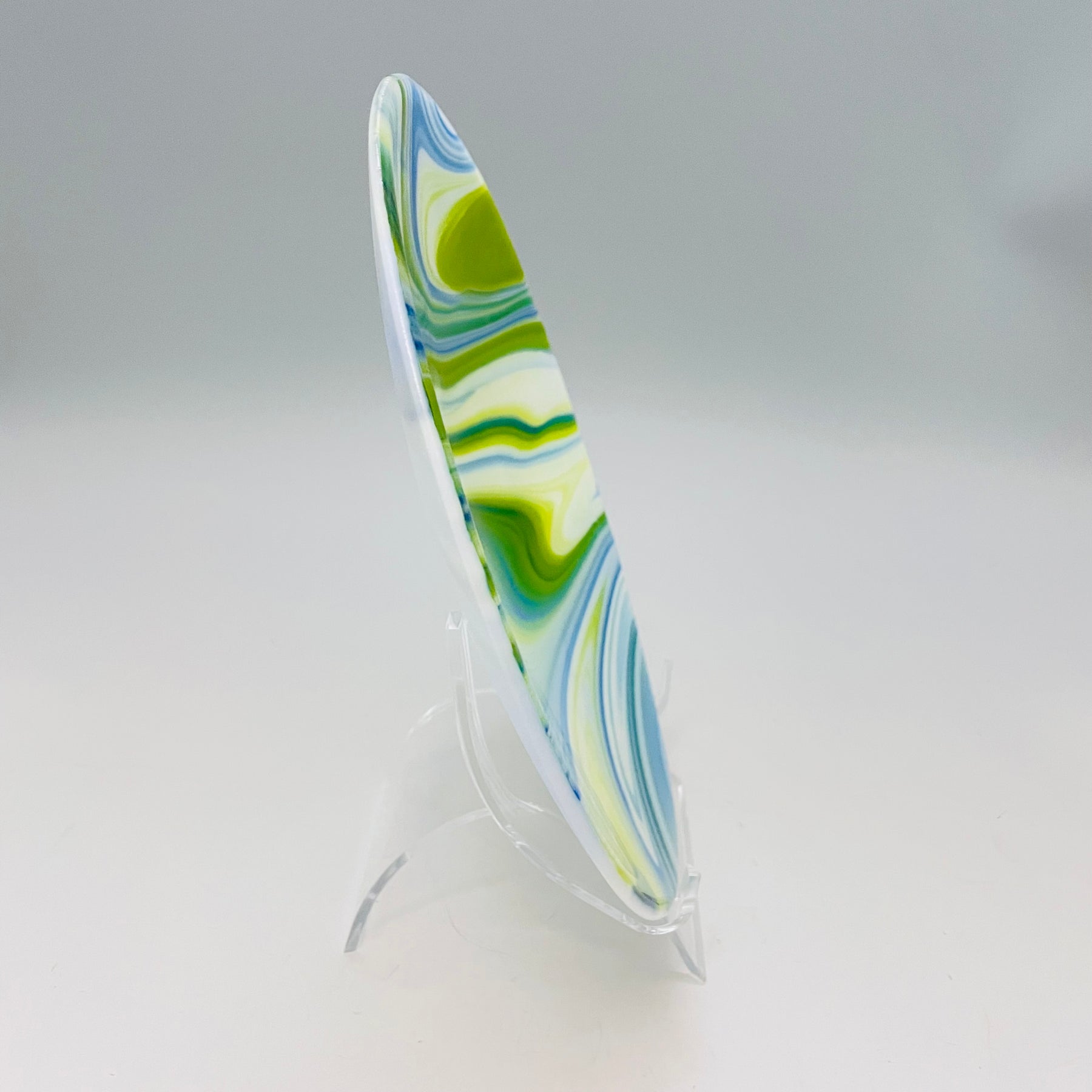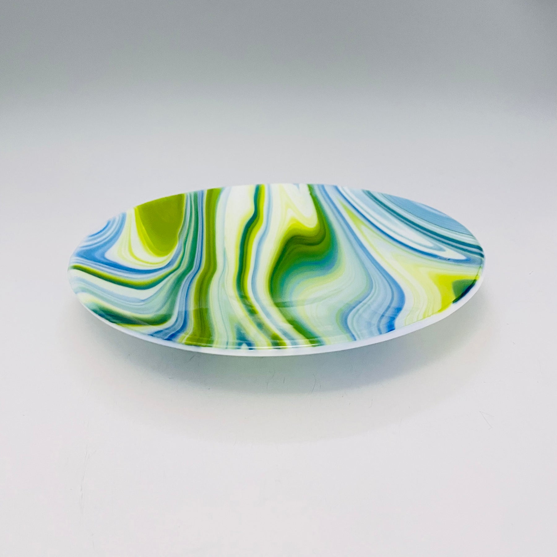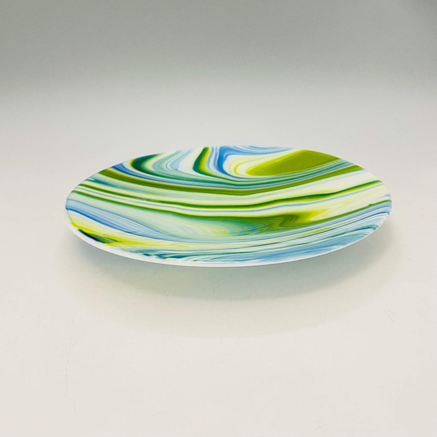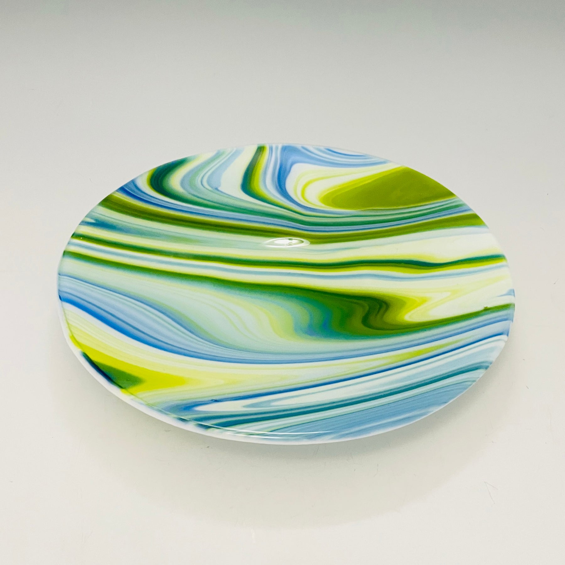 Artistic Process: It is made of hand cut glass in a layout to create a flow and pattern for a full fuse with a proper anneal. It was then kilnformed to shape into an large bowl in a final firing in the kiln.