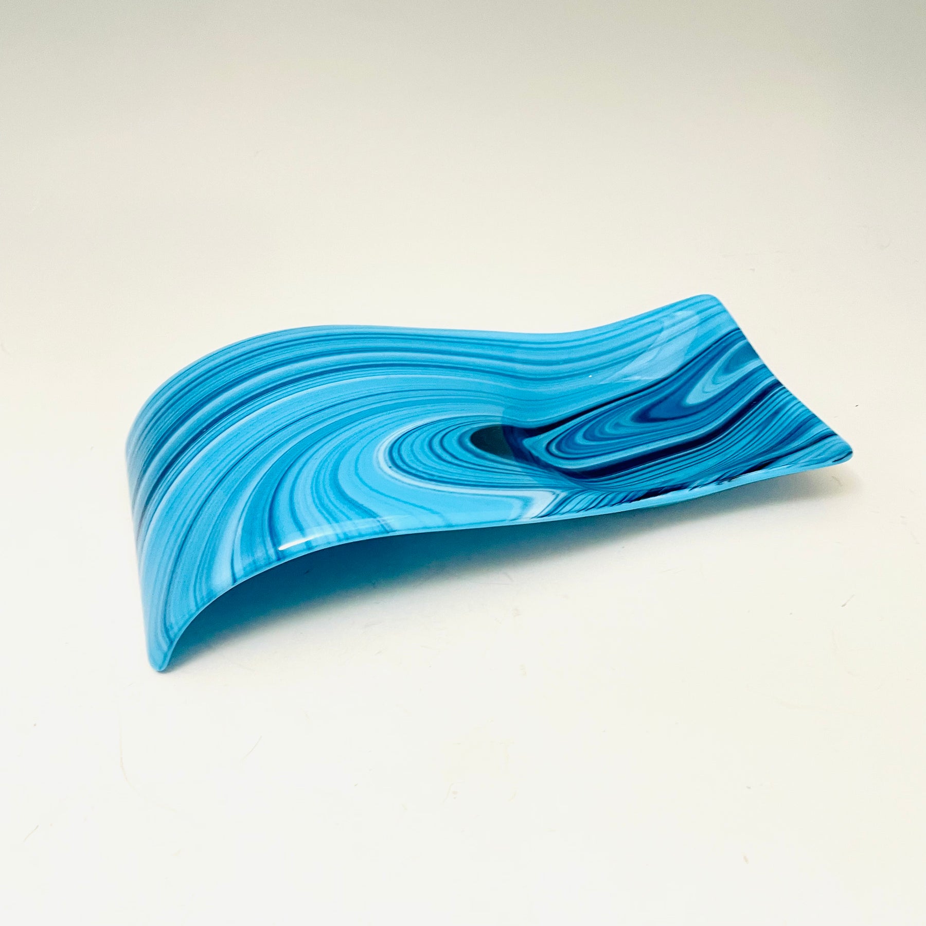 Artistic Process:.  It is made of hand cut glass in a layout to create a flow and pattern for a full fuse, after coldworking, the glass is firepolished.  The last step is to slump into a ceramic mold to achieve its final shape.
