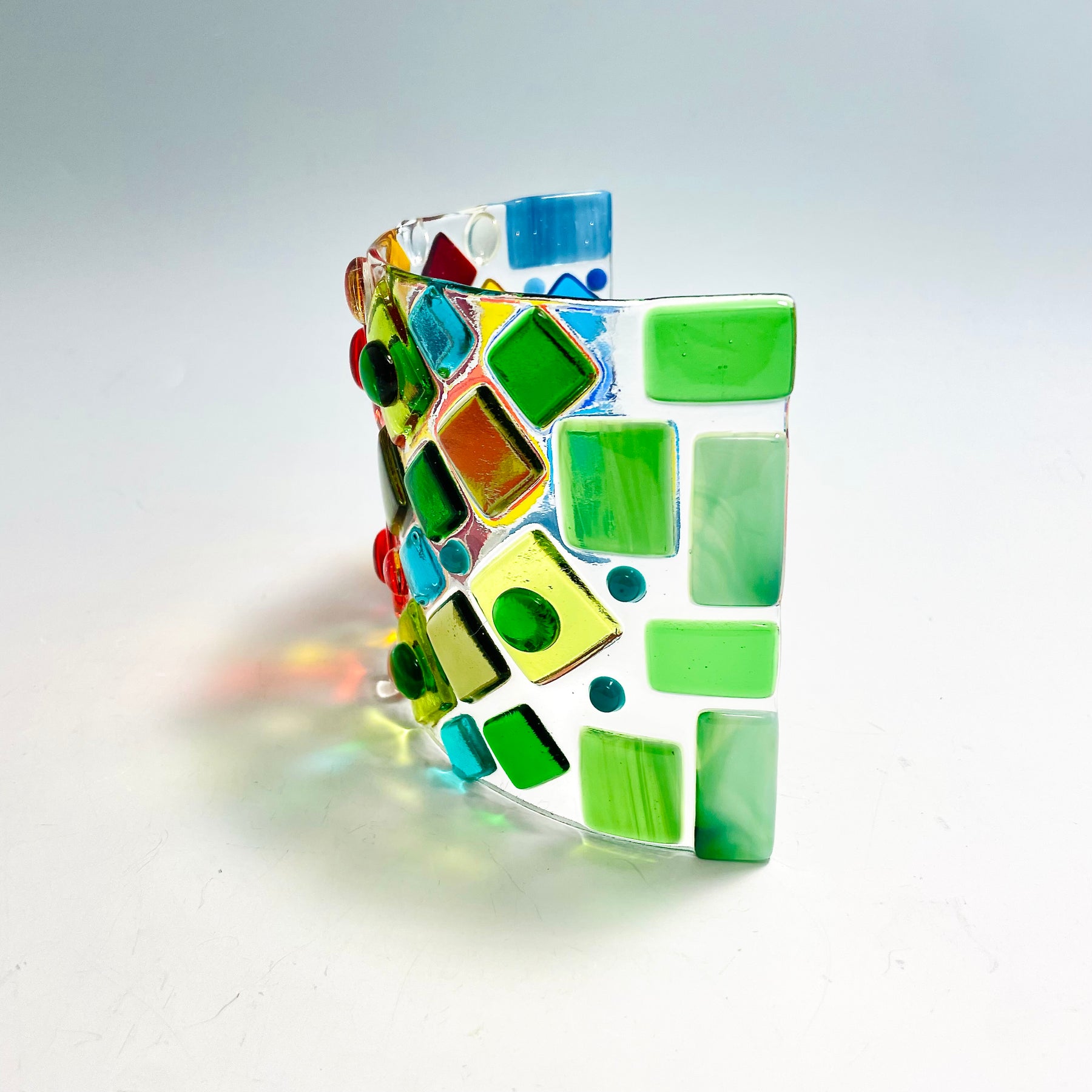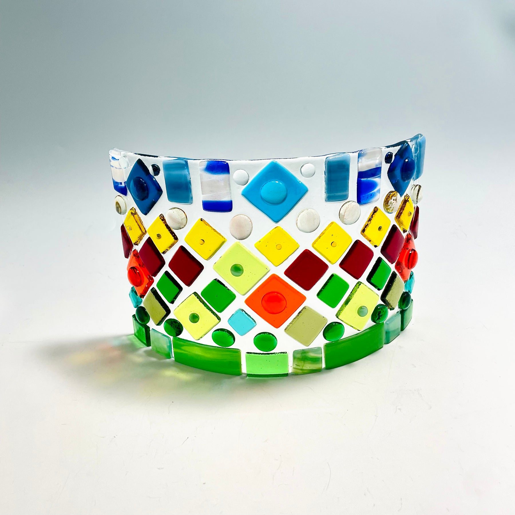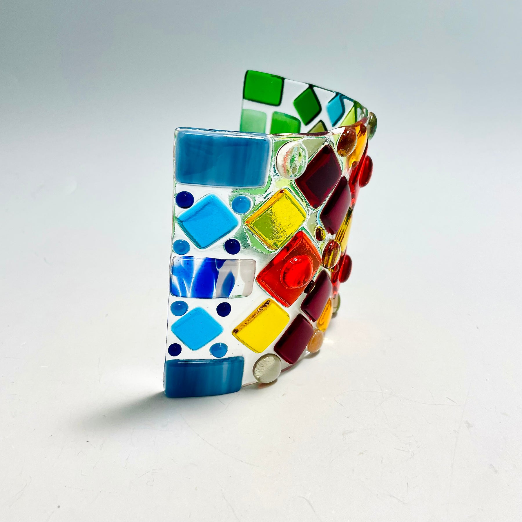 Artistic Process: The glass was cut and put together in a design and fused together. The final firing was to form the glass into its curved shape with the bottom ground so it stands level and stable.