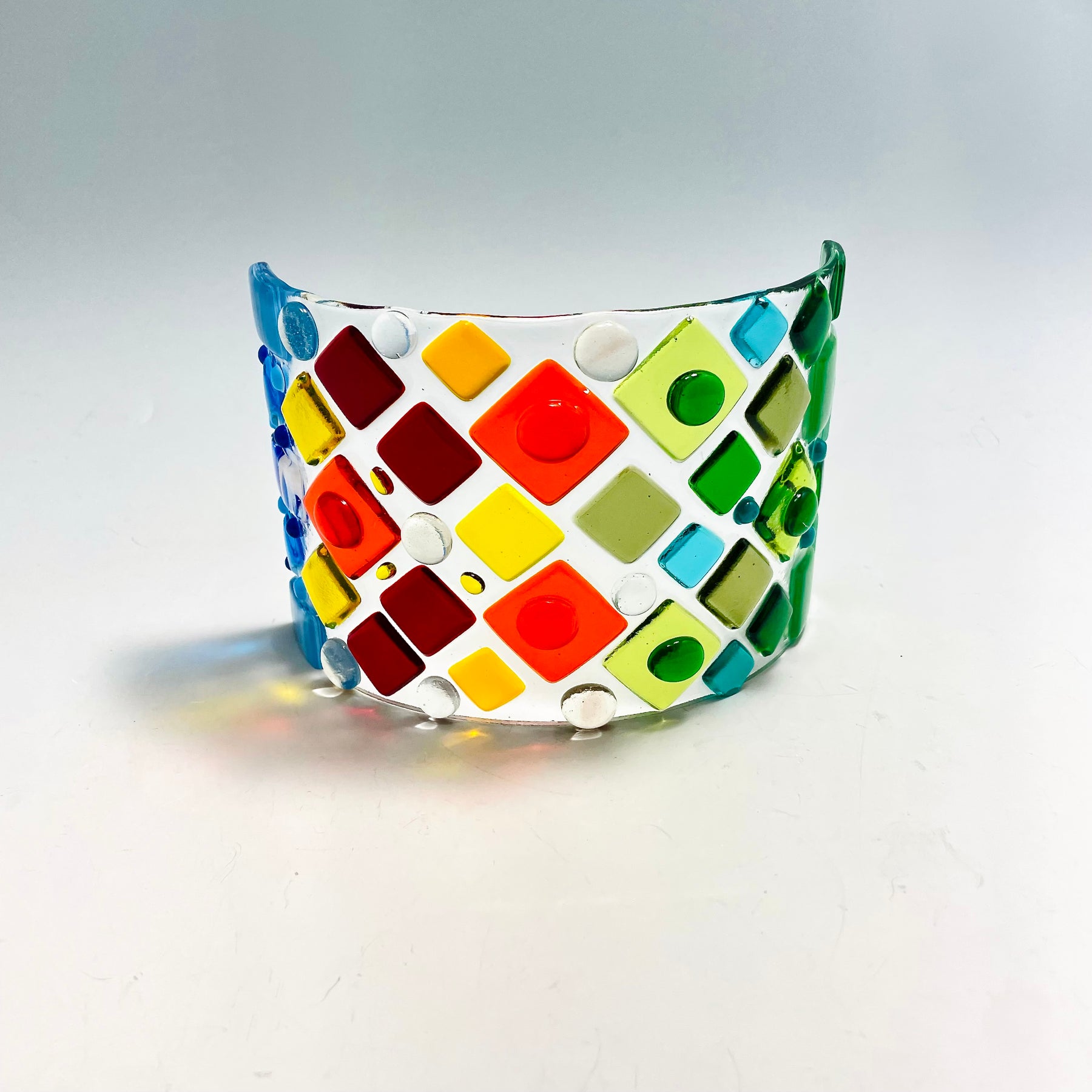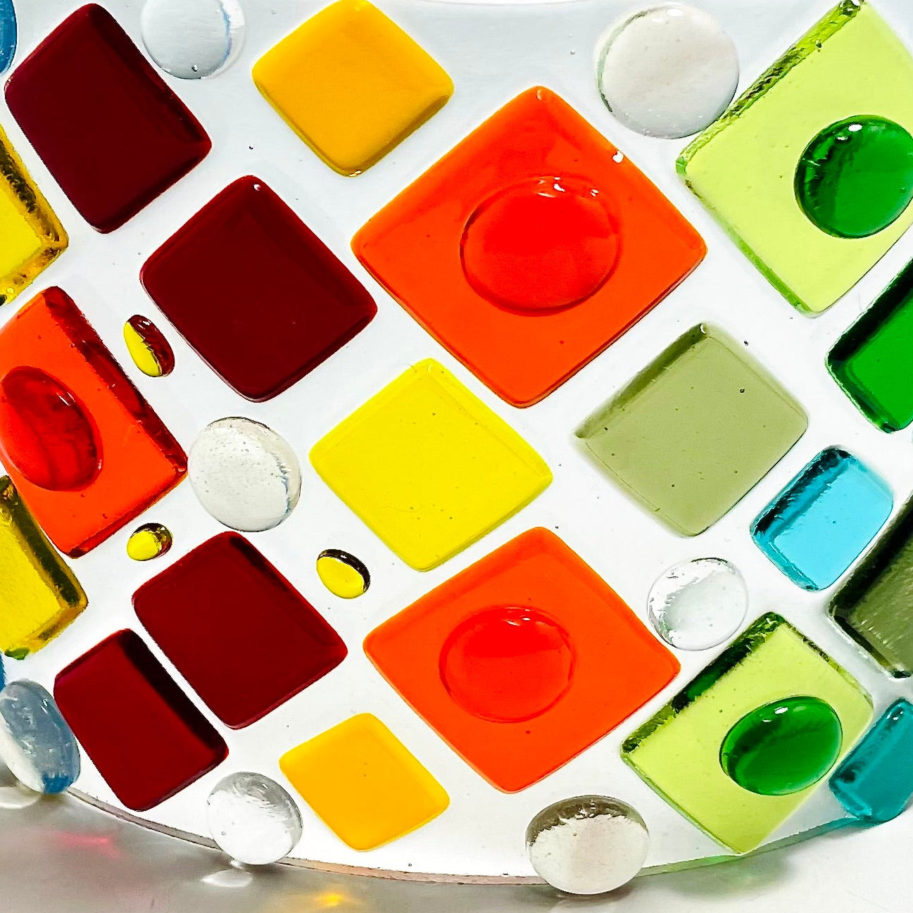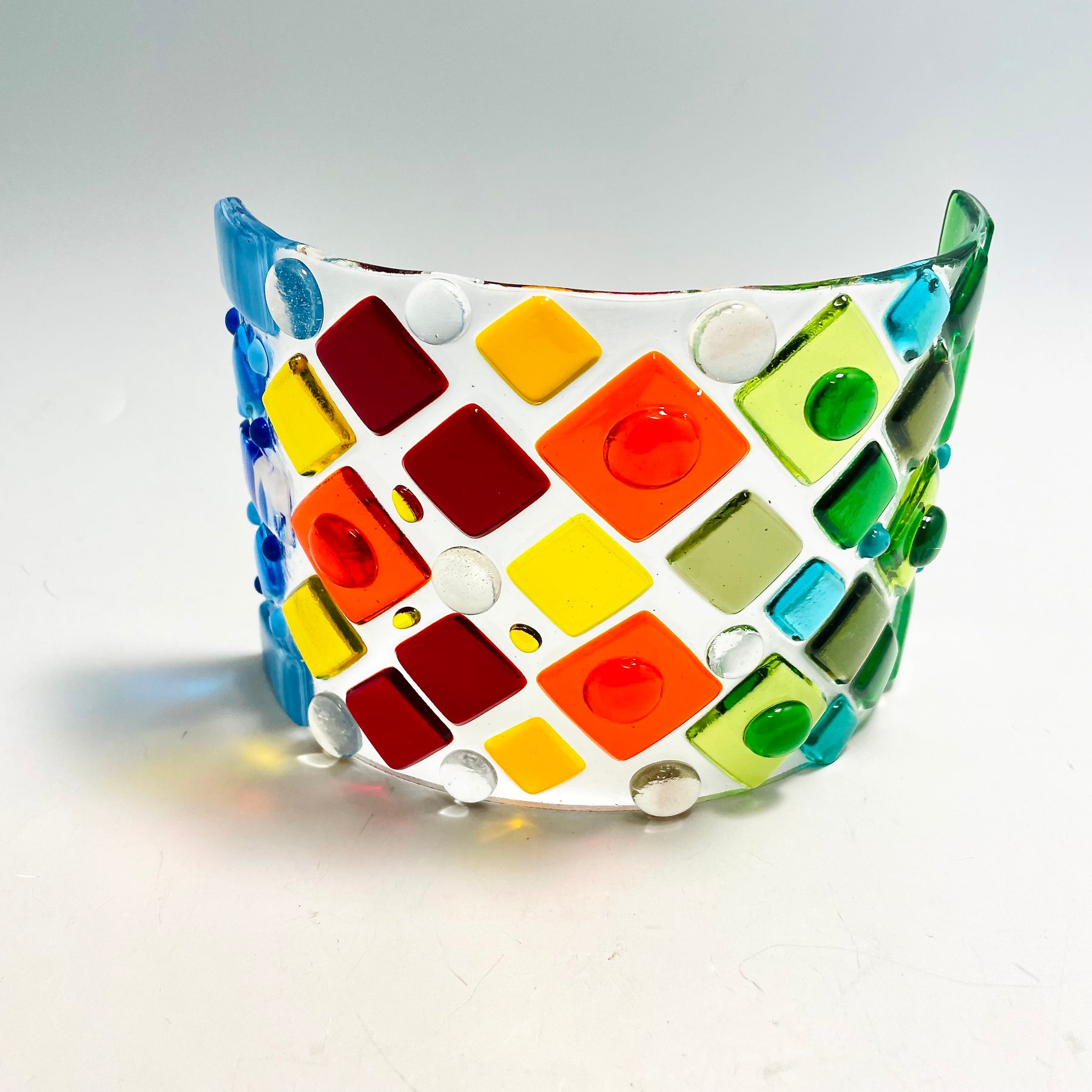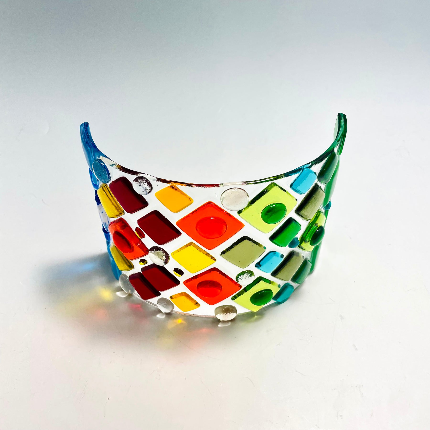 Artistic Process: The glass was cut and put together in a design and fused together. The final firing was to form the glass into its curved shape with the bottom ground so it stands level and stable.