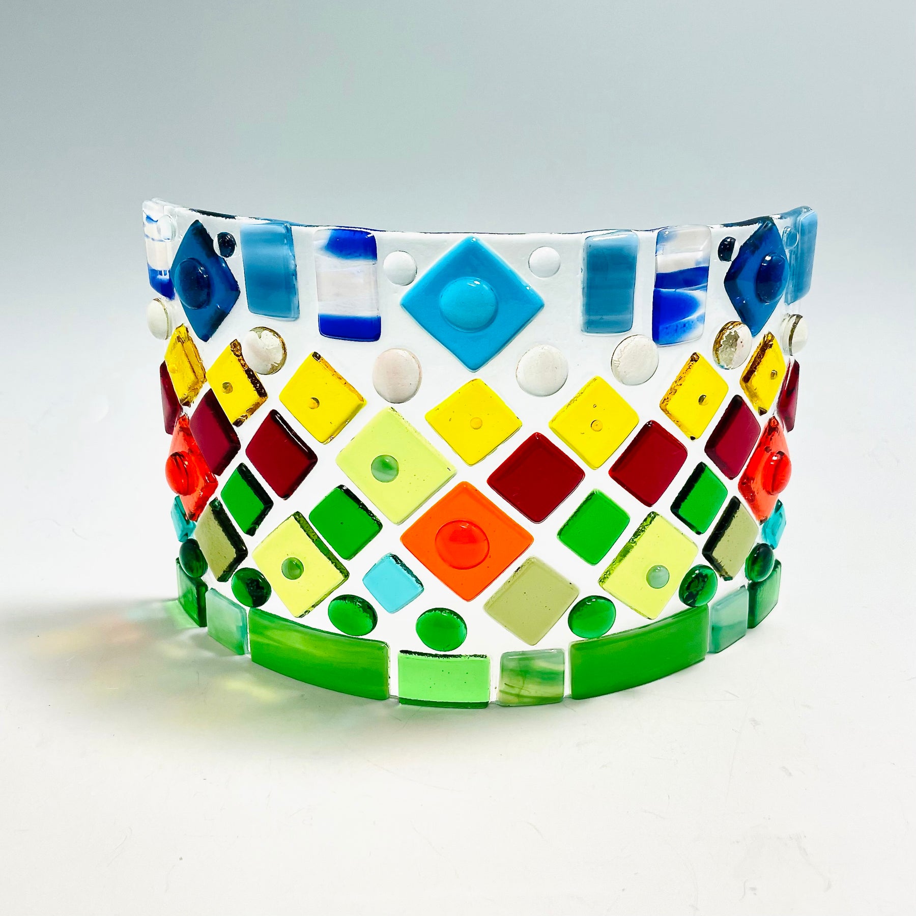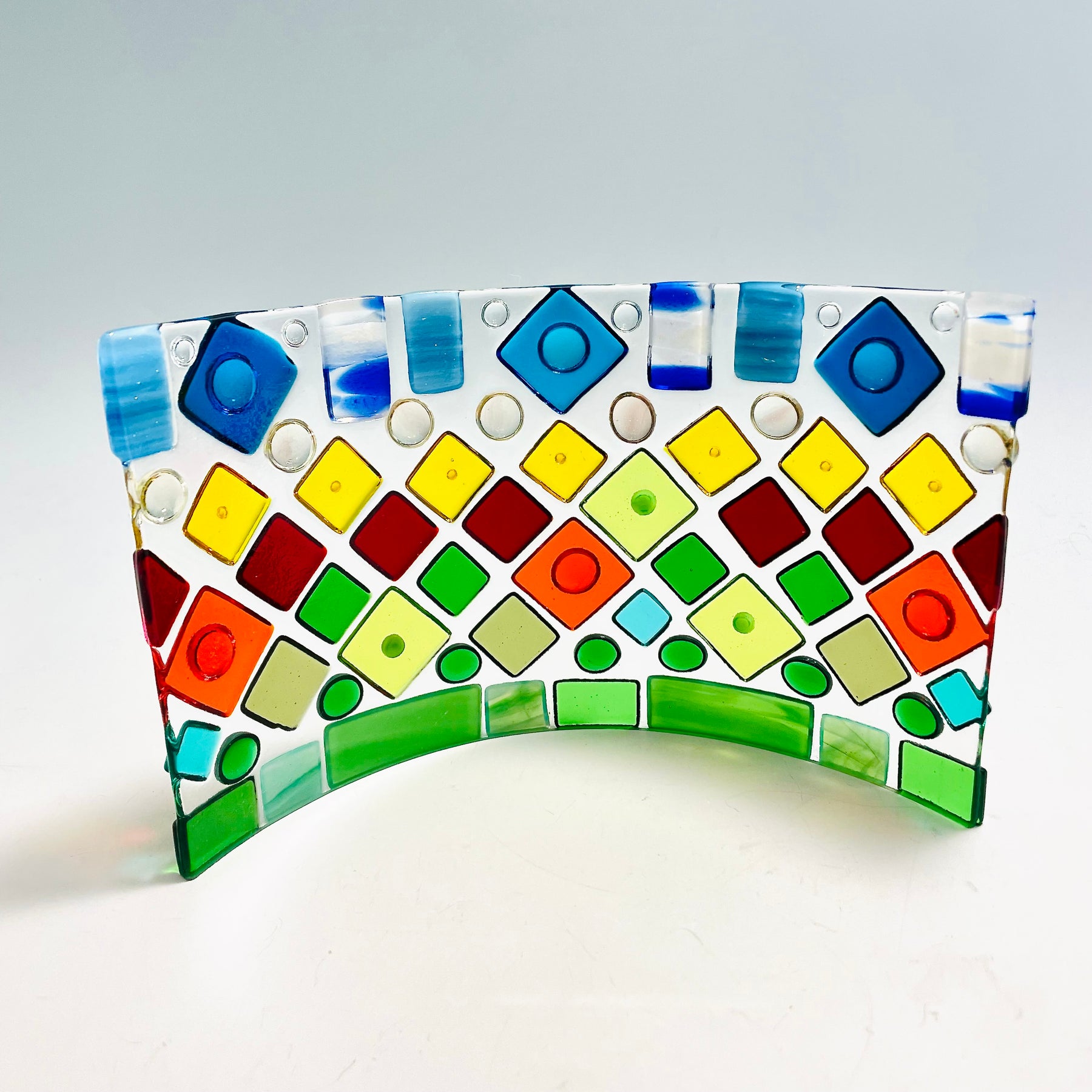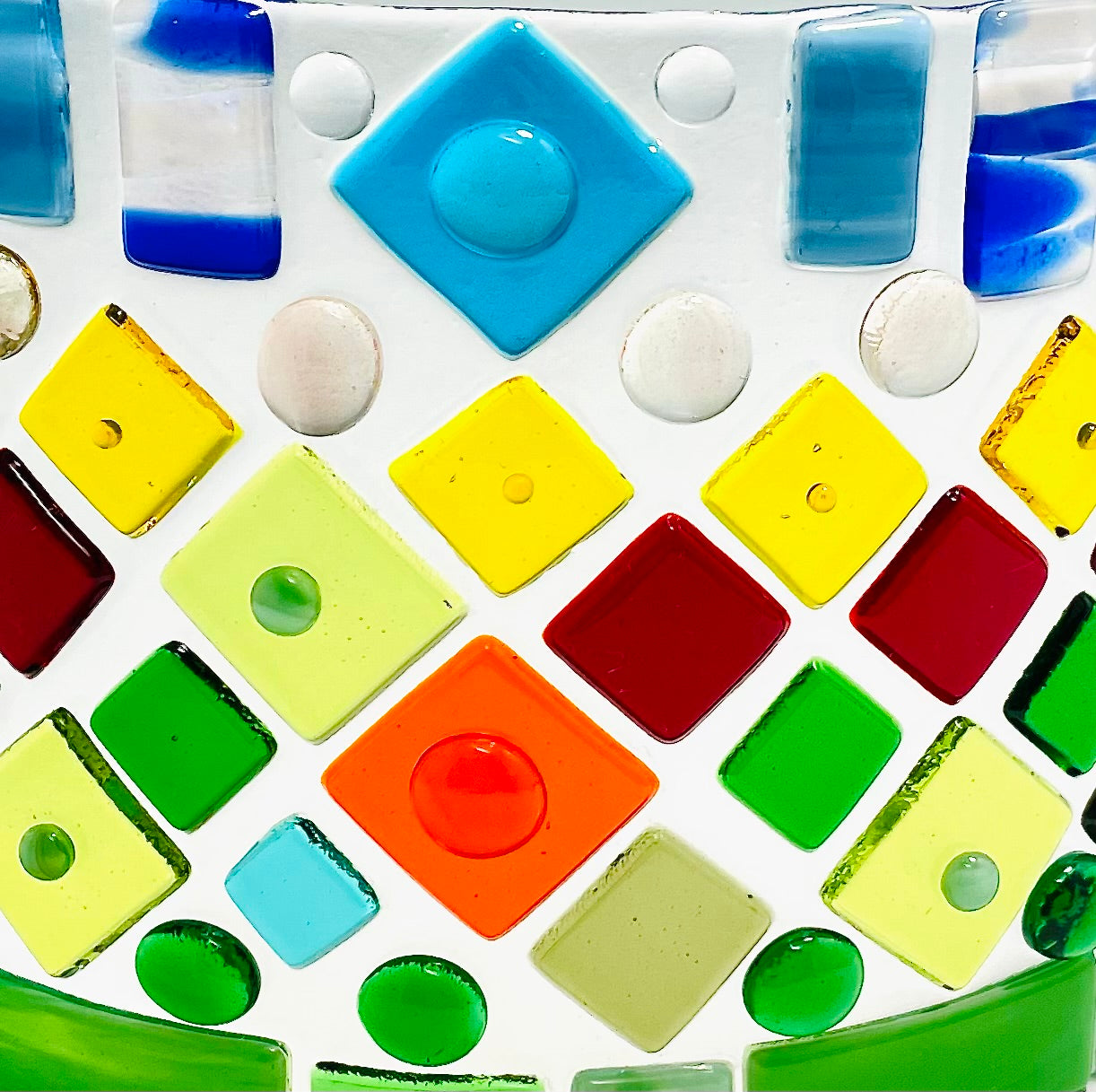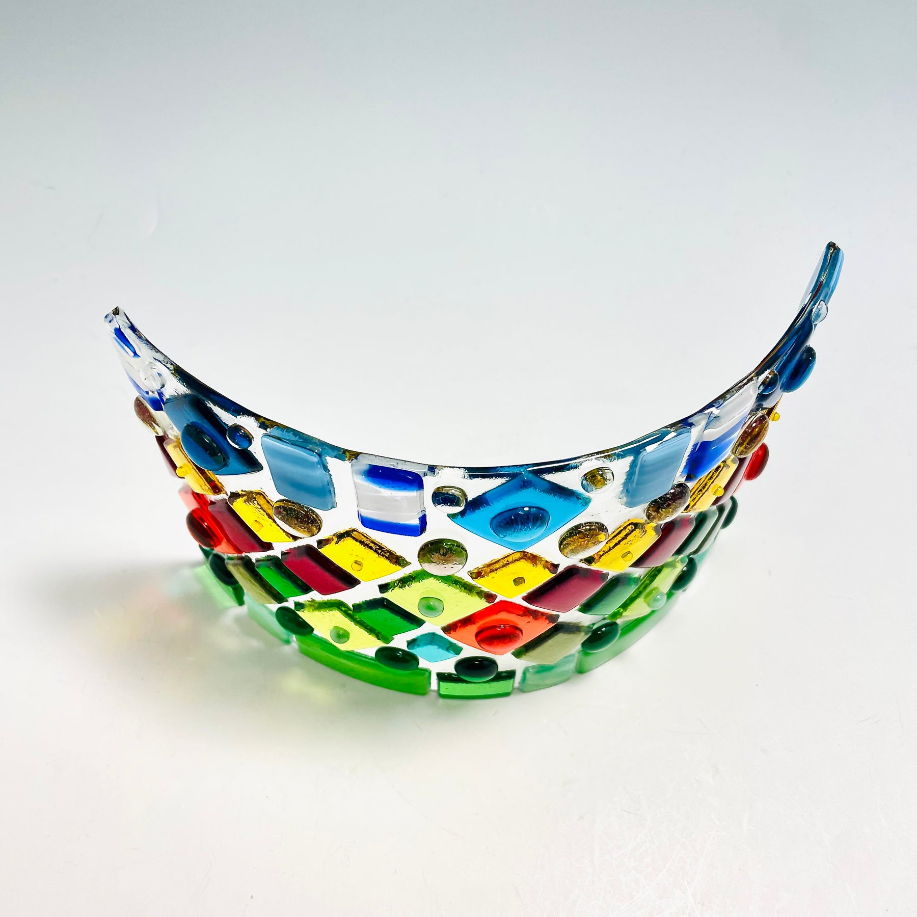 Artistic Process: The glass was cut and put together in a design and fused together. The final firing was to form the glass into its curved shape with the bottom ground so it stands level and stable.