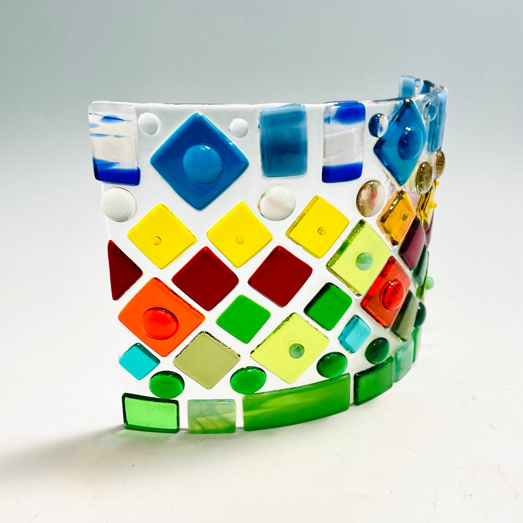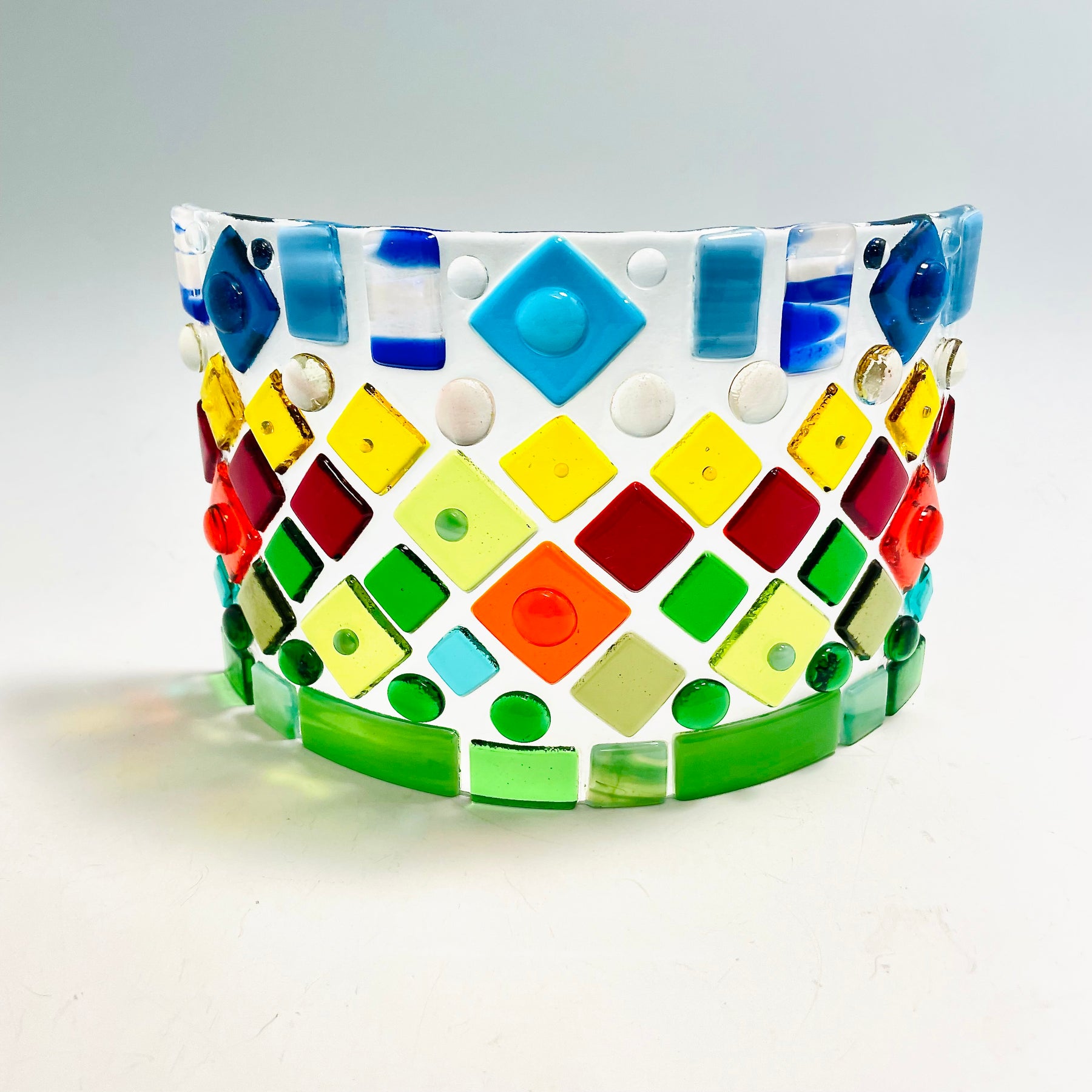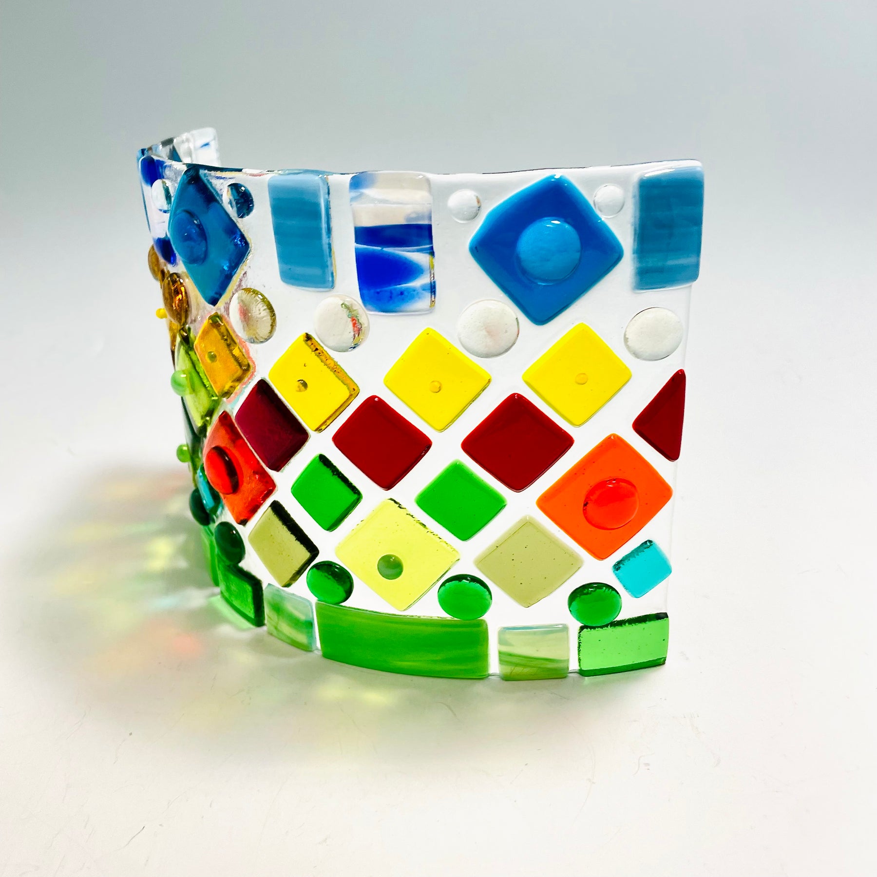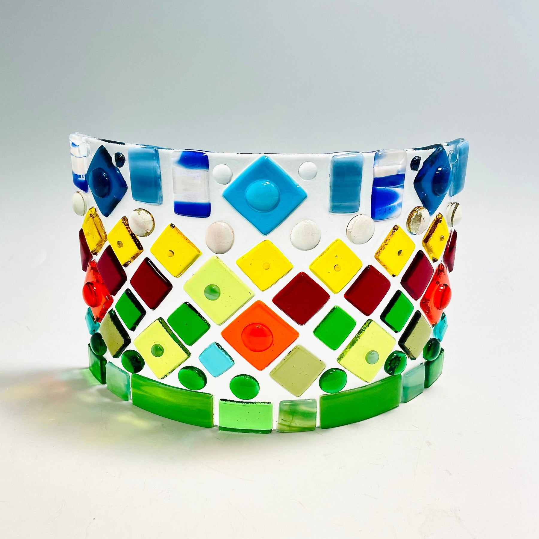 Artistic Process: The glass was cut and put together in a design and fused together. The final firing was to form the glass into its curved shape with the bottom ground so it stands level and stable.