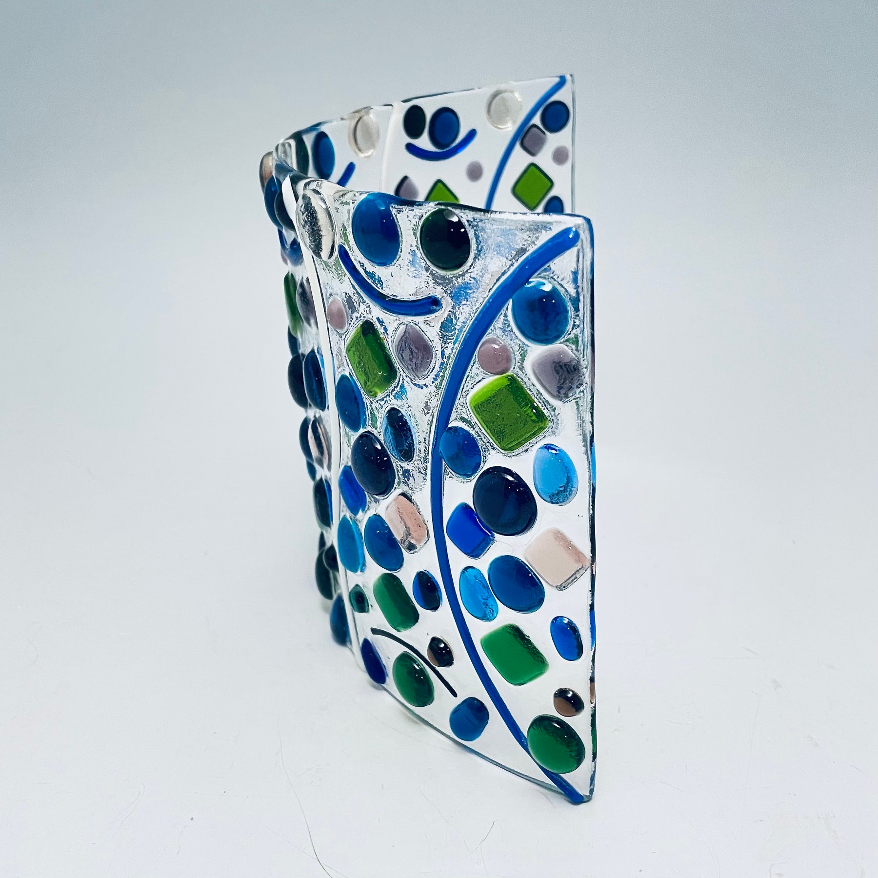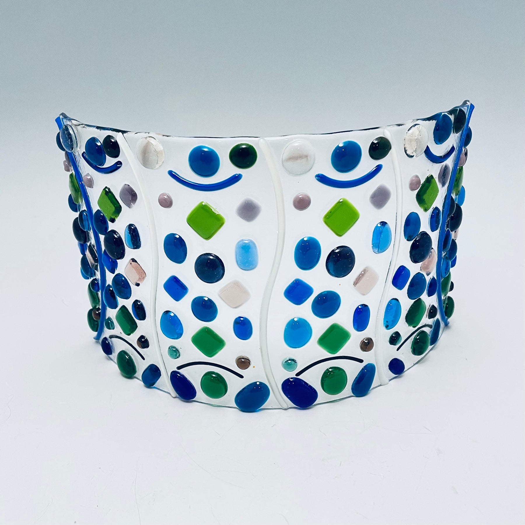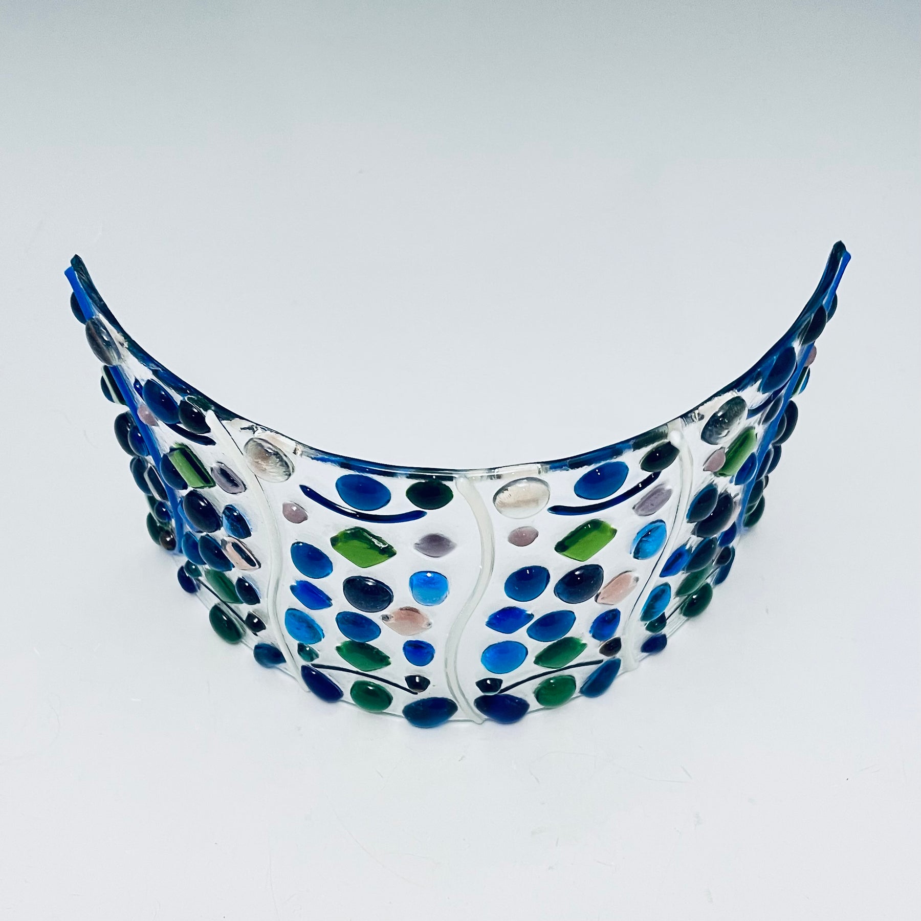 Artistic Process: The glass was cut and put together in a design and fused together. The final firing was to form the glass into its curved shape with the bottom ground so it stands level and stable.
