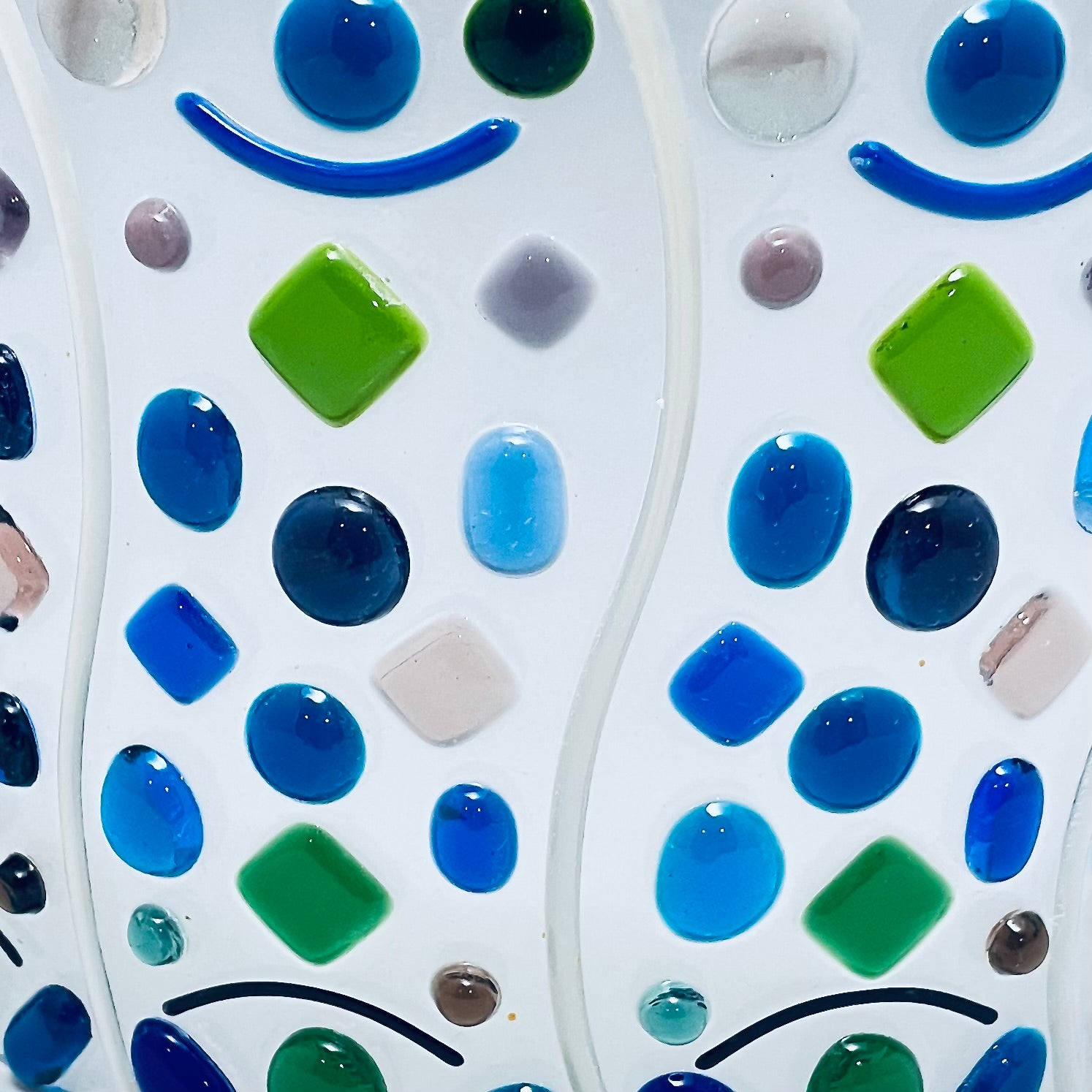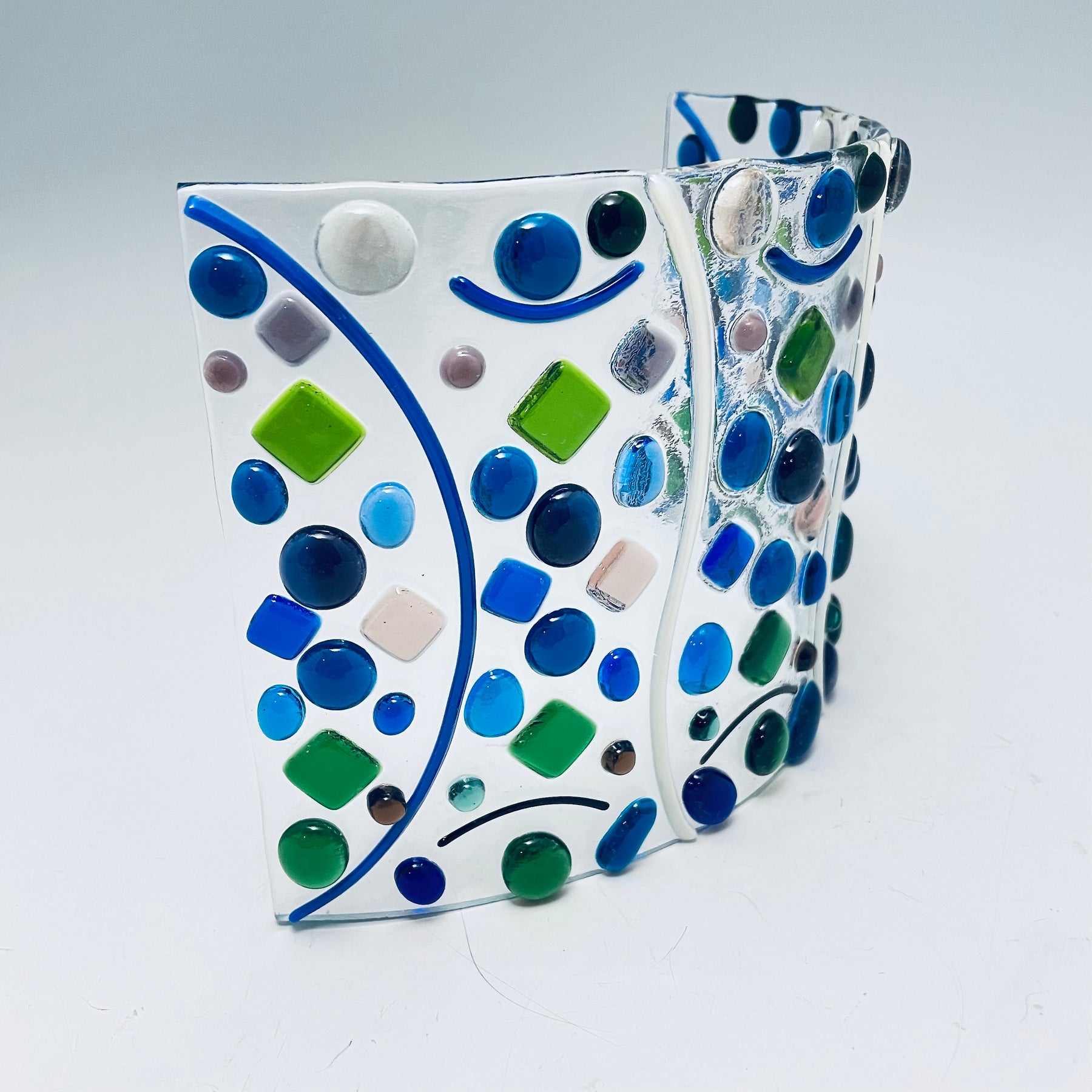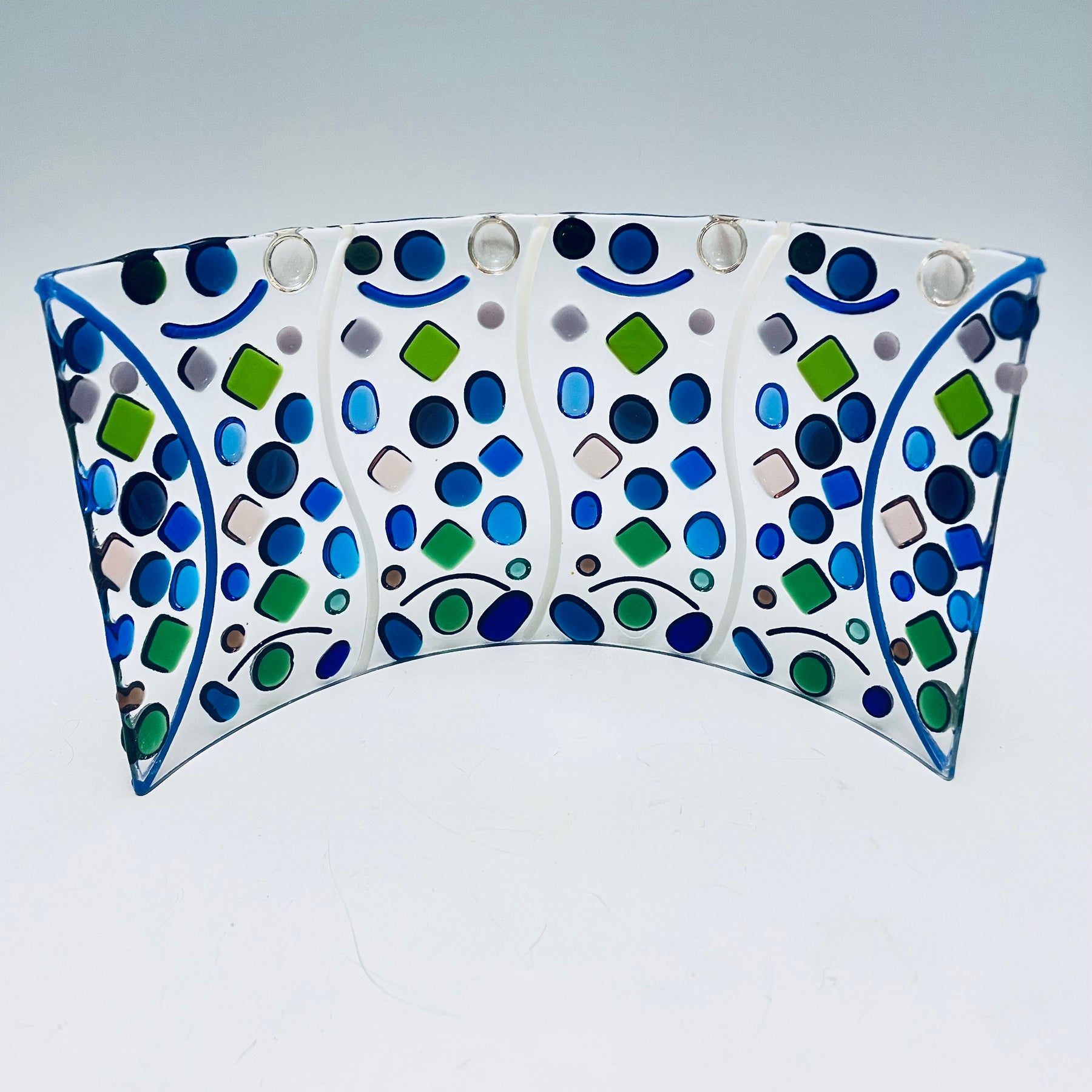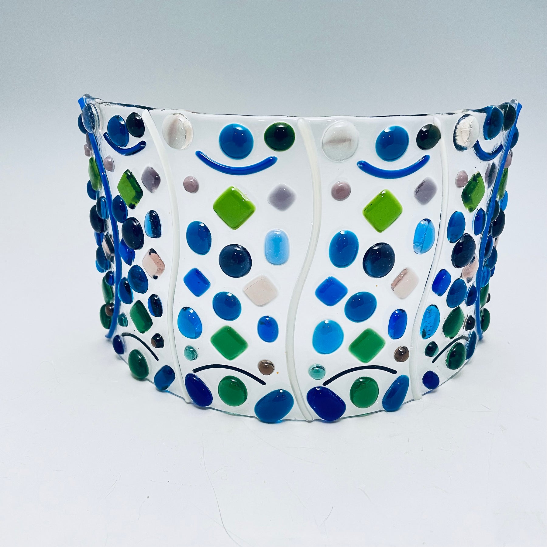 Artistic Process: The glass was cut and put together in a design and fused together. The final firing was to form the glass into its curved shape with the bottom ground so it stands level and stable.