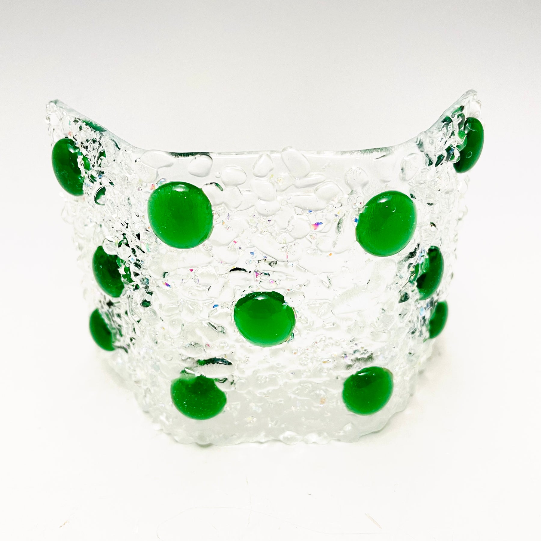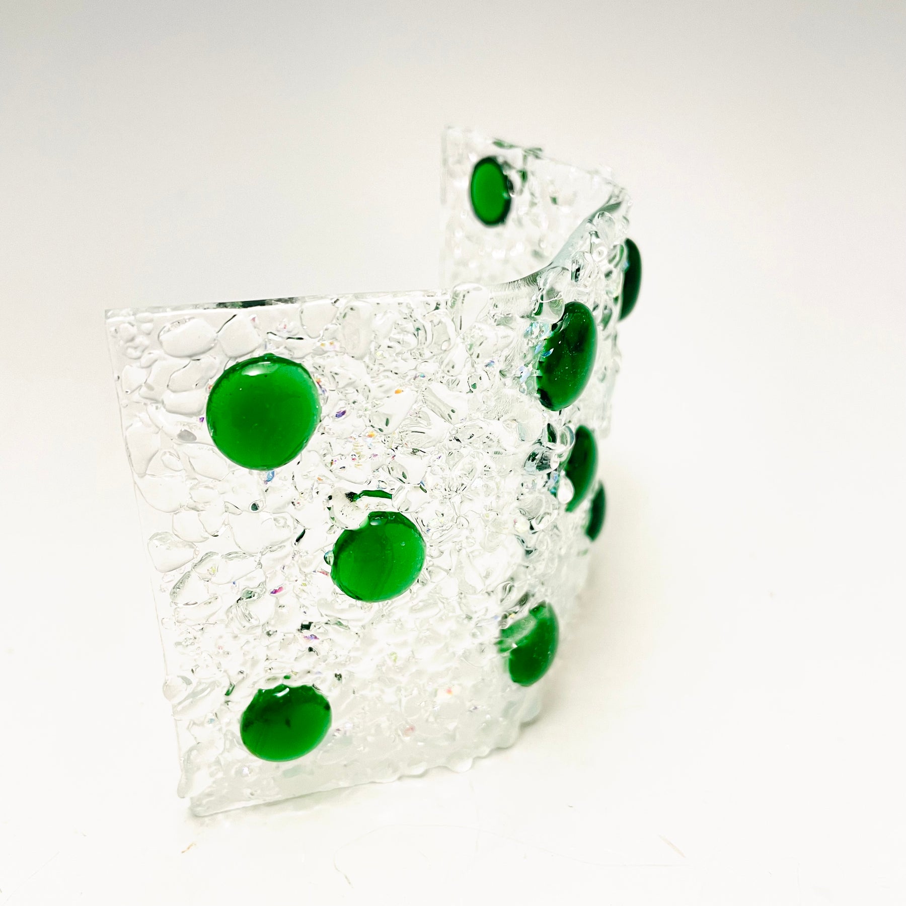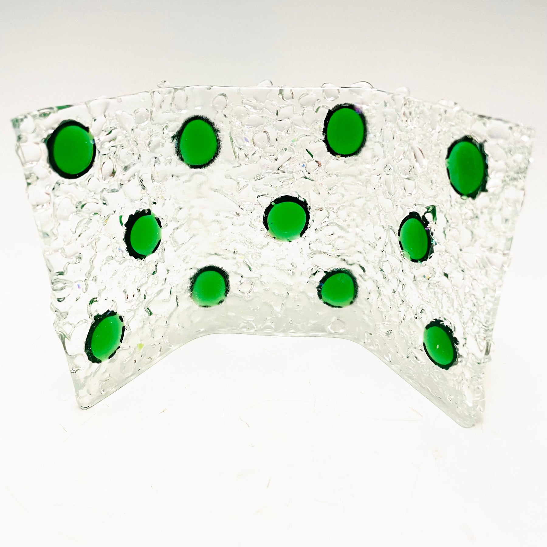 Artistic Process: The glass was cut and put together in a design and fused together. The final firing was to form the glass into its curved shape with the bottom ground so it stands level and stable.