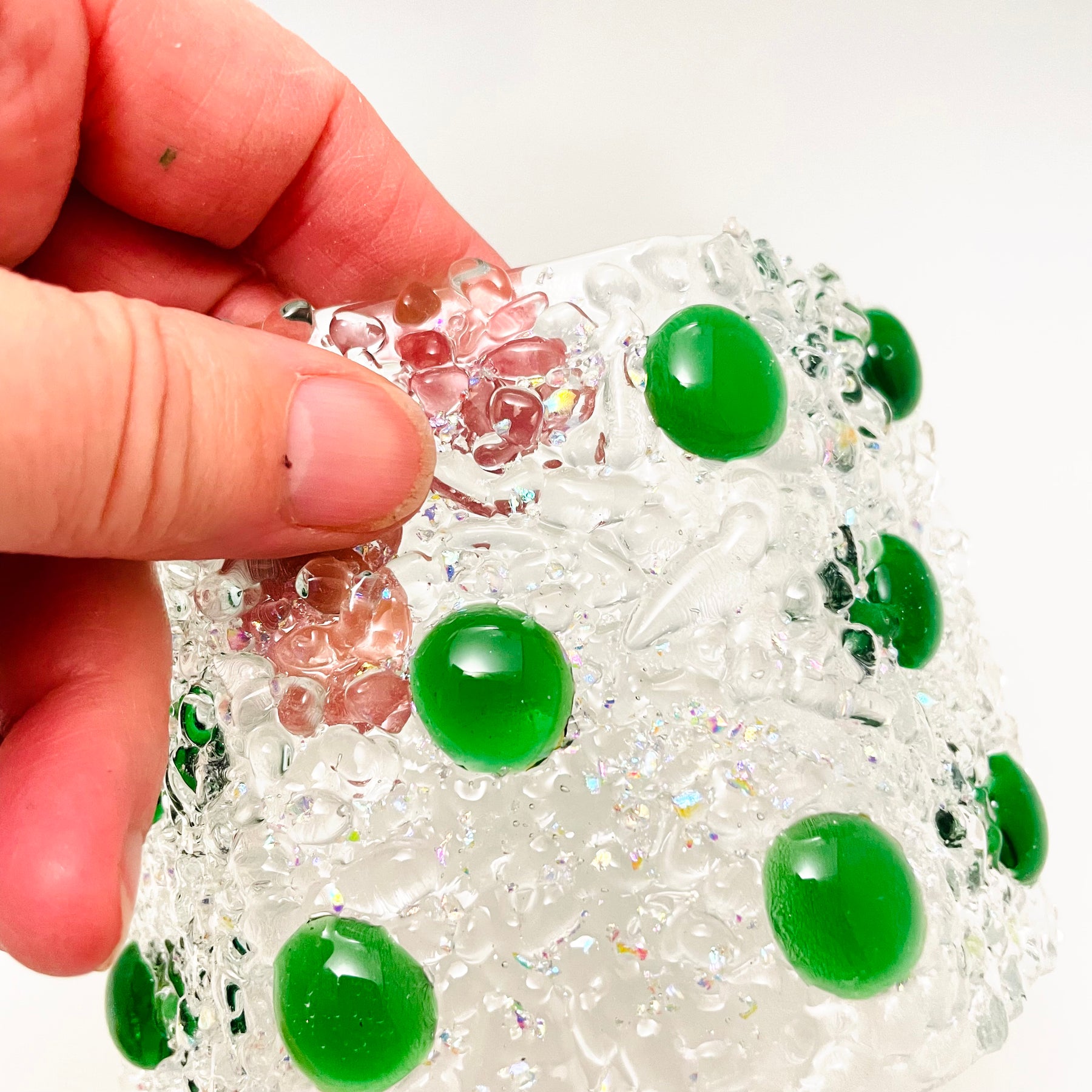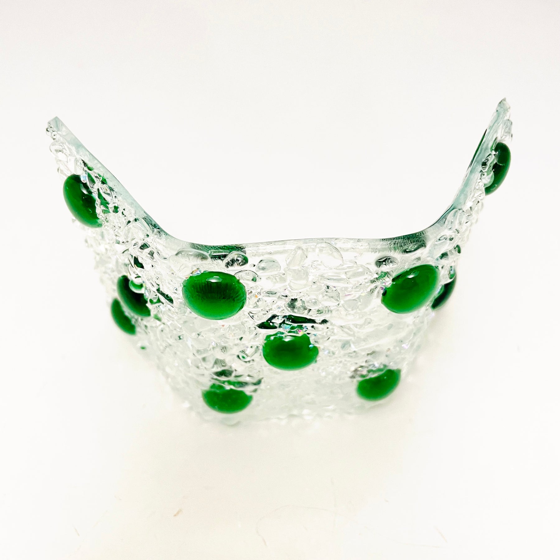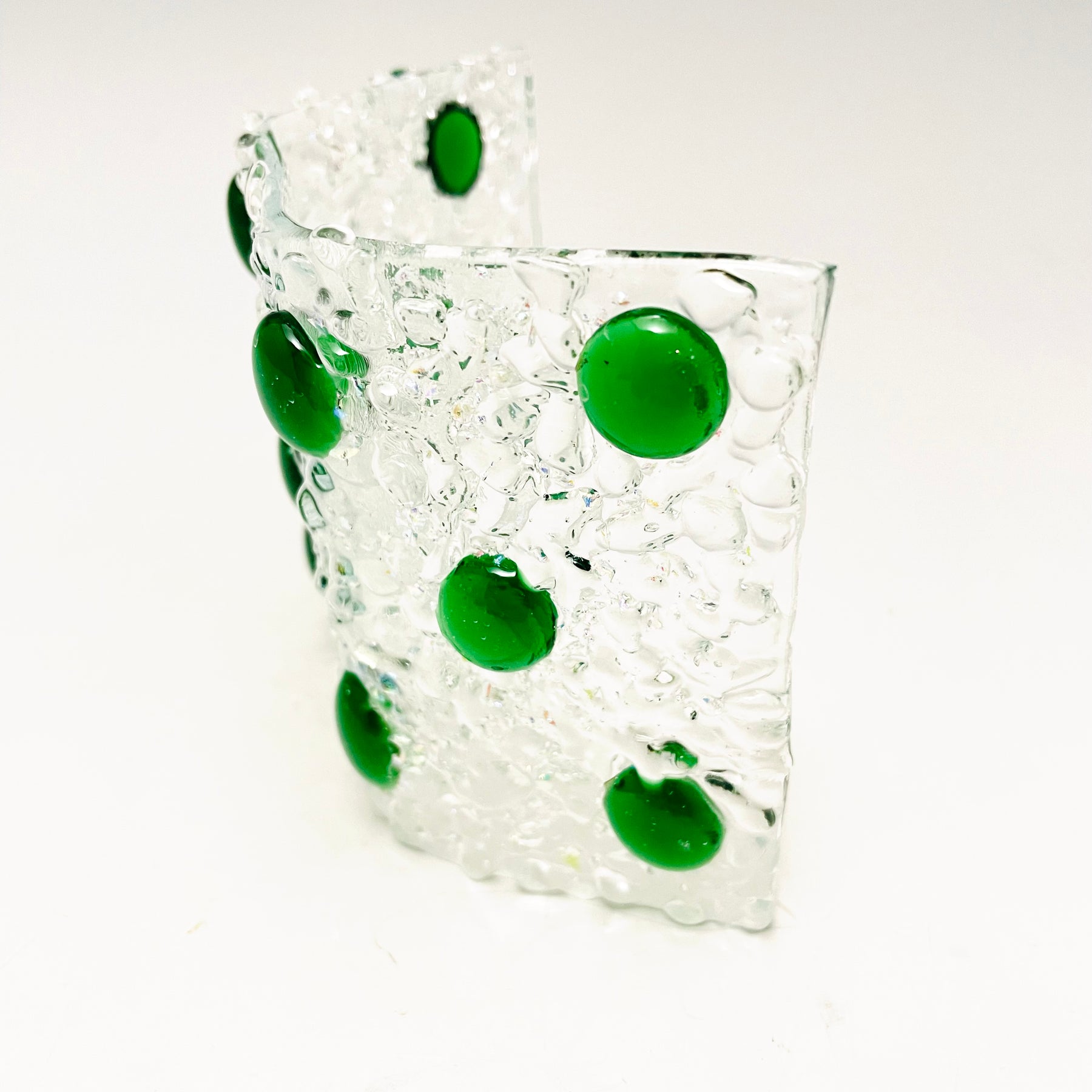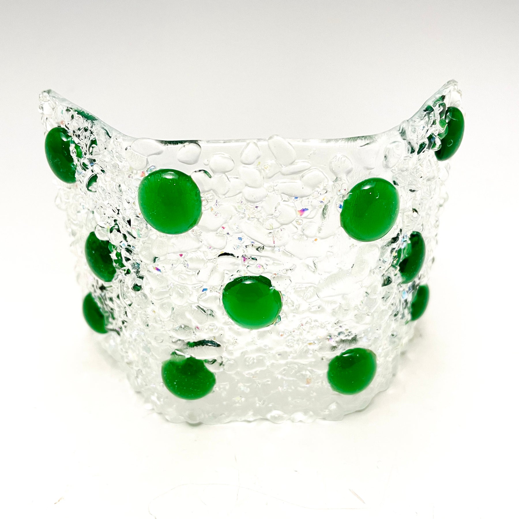 Artistic Process: The glass was cut and put together in a design and fused together. The final firing was to form the glass into its curved shape with the bottom ground so it stands level and stable.