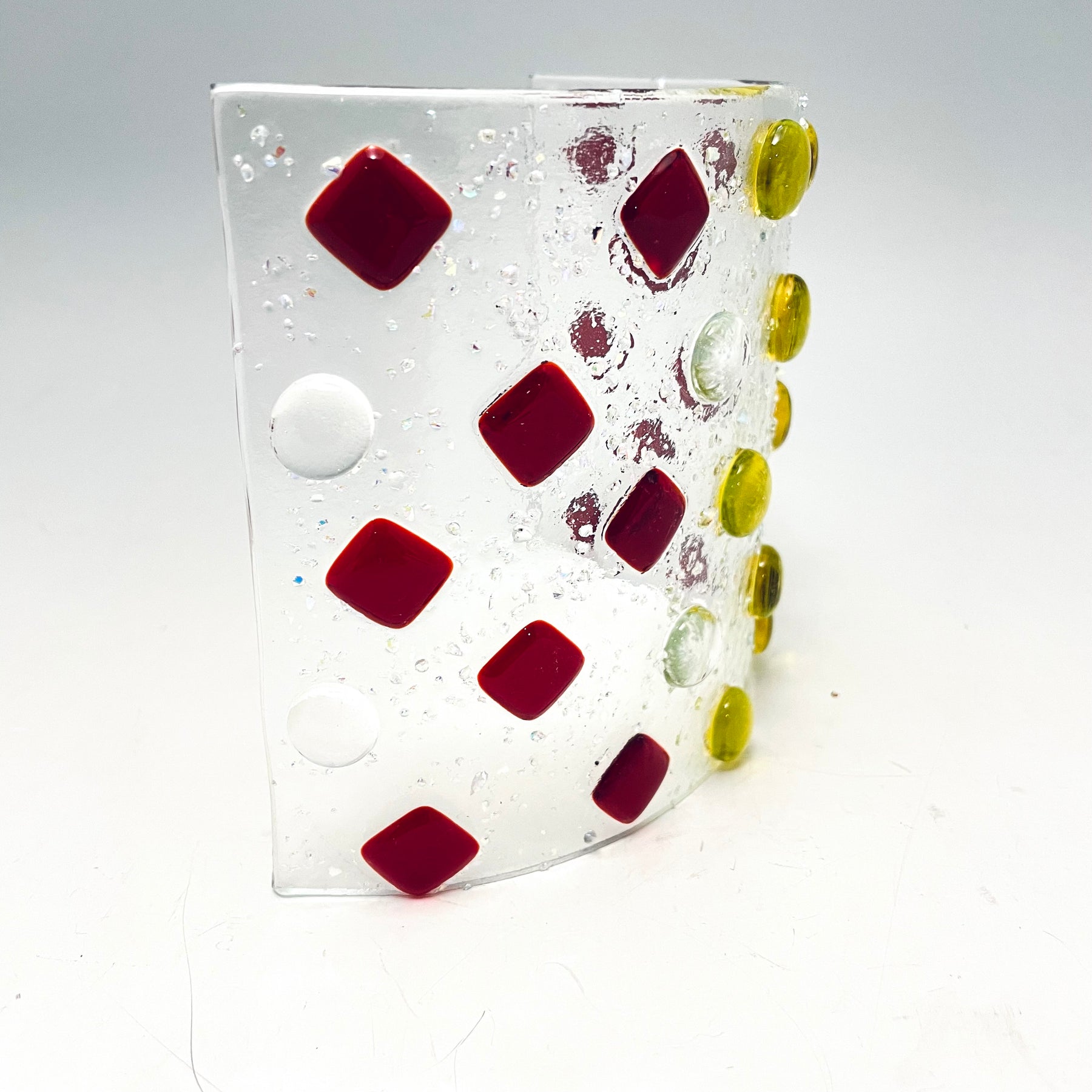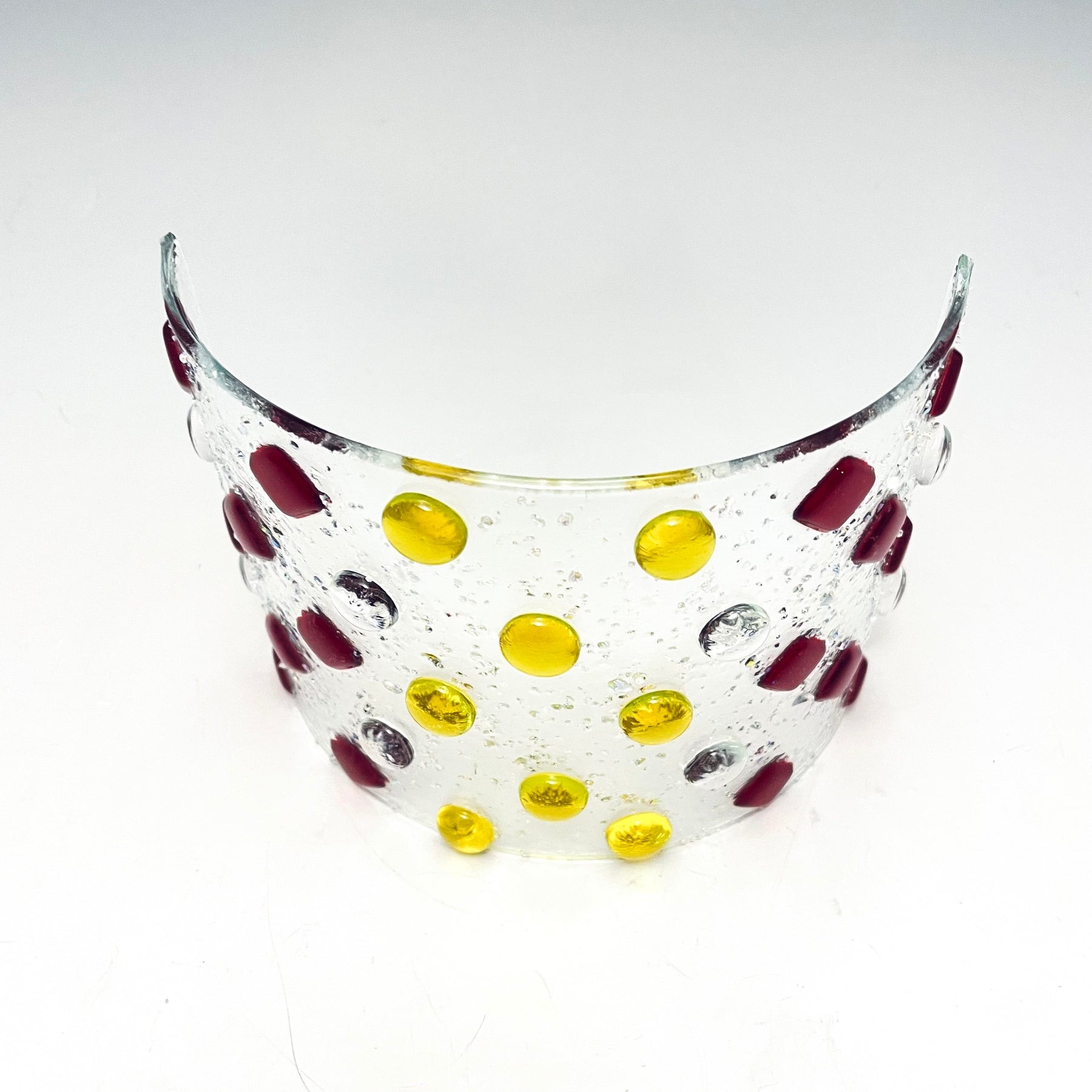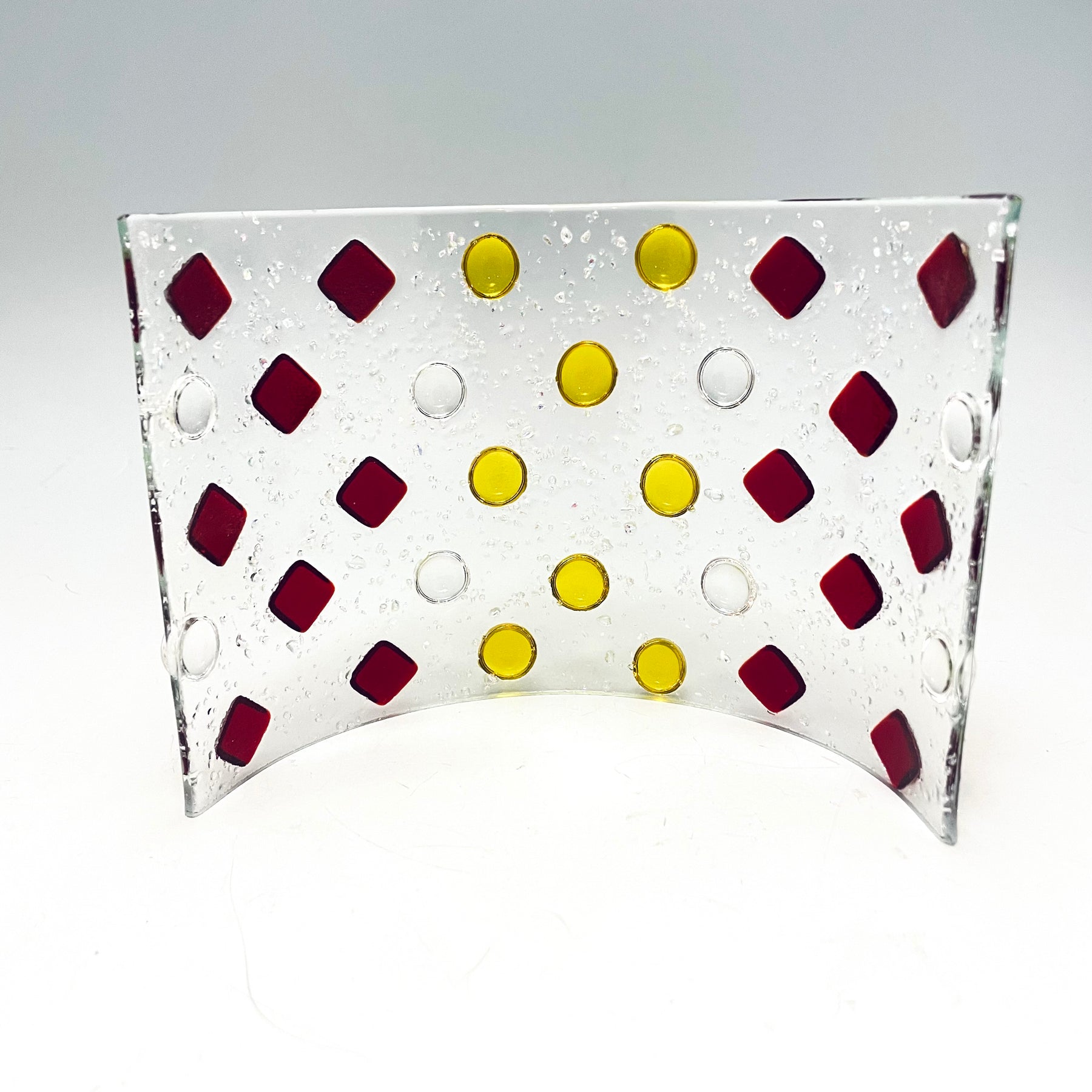 Artistic Process: The glass was cut and put together in a design and fused together.  The final firing was to form the glass into its curved shape with the bottom ground so it stands level and stable.