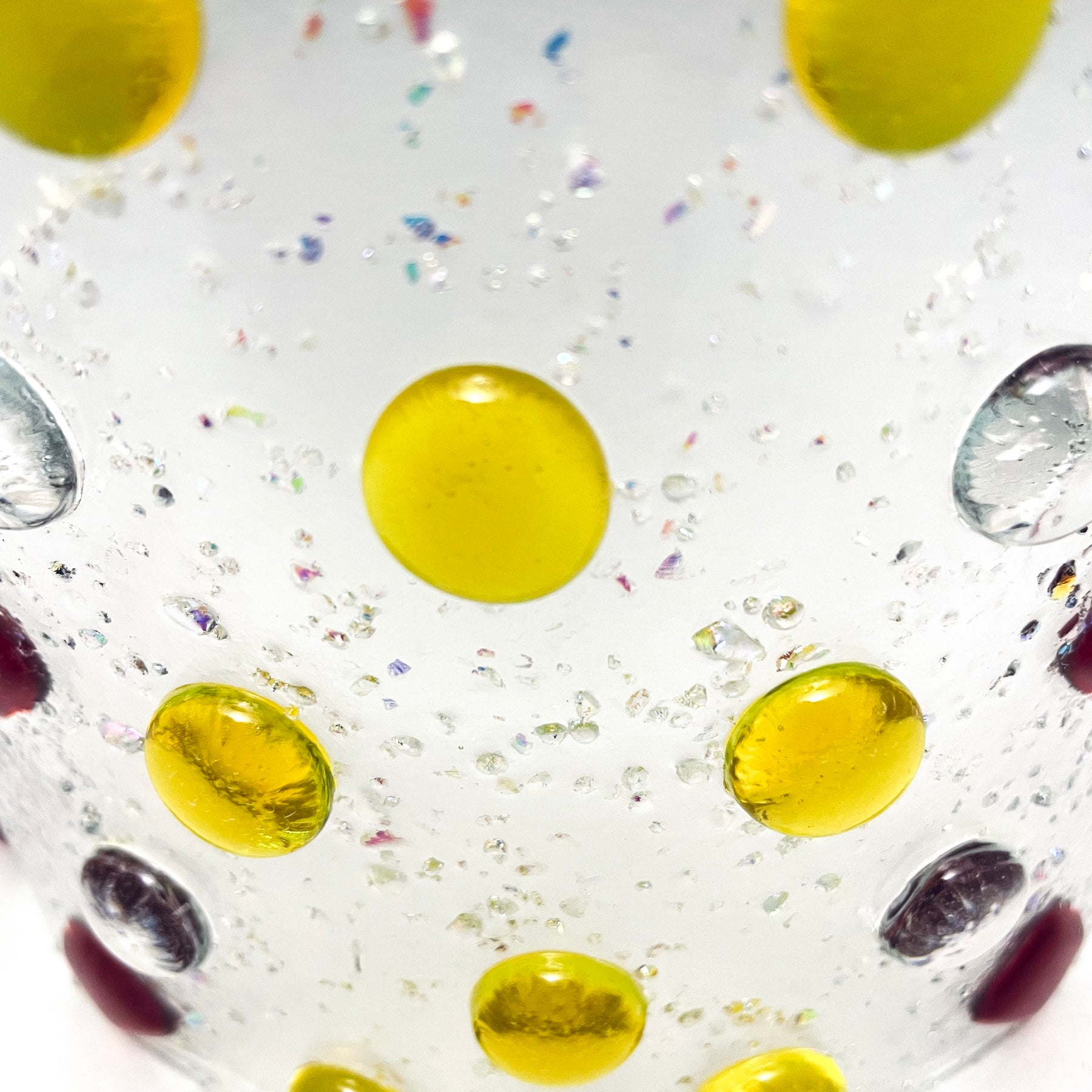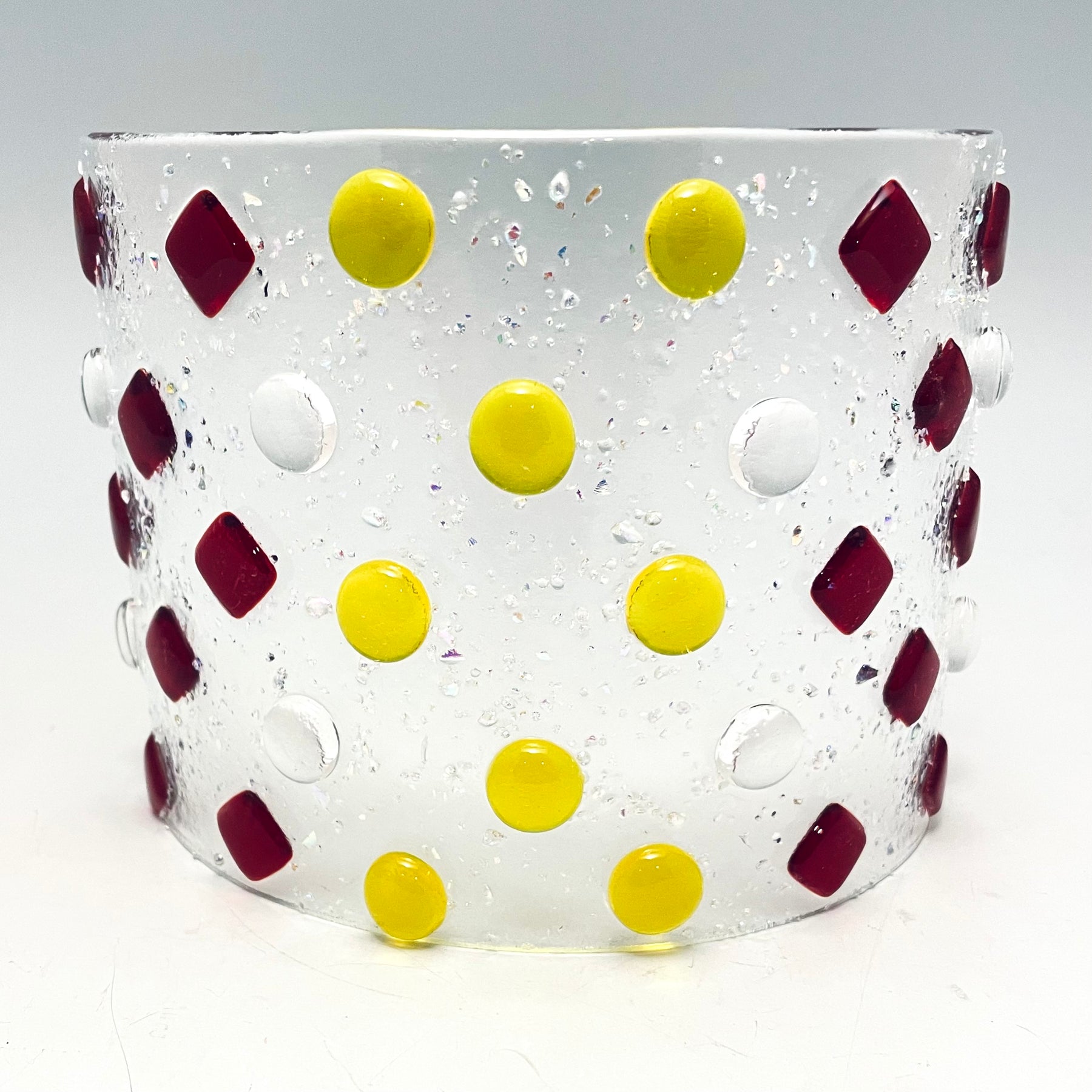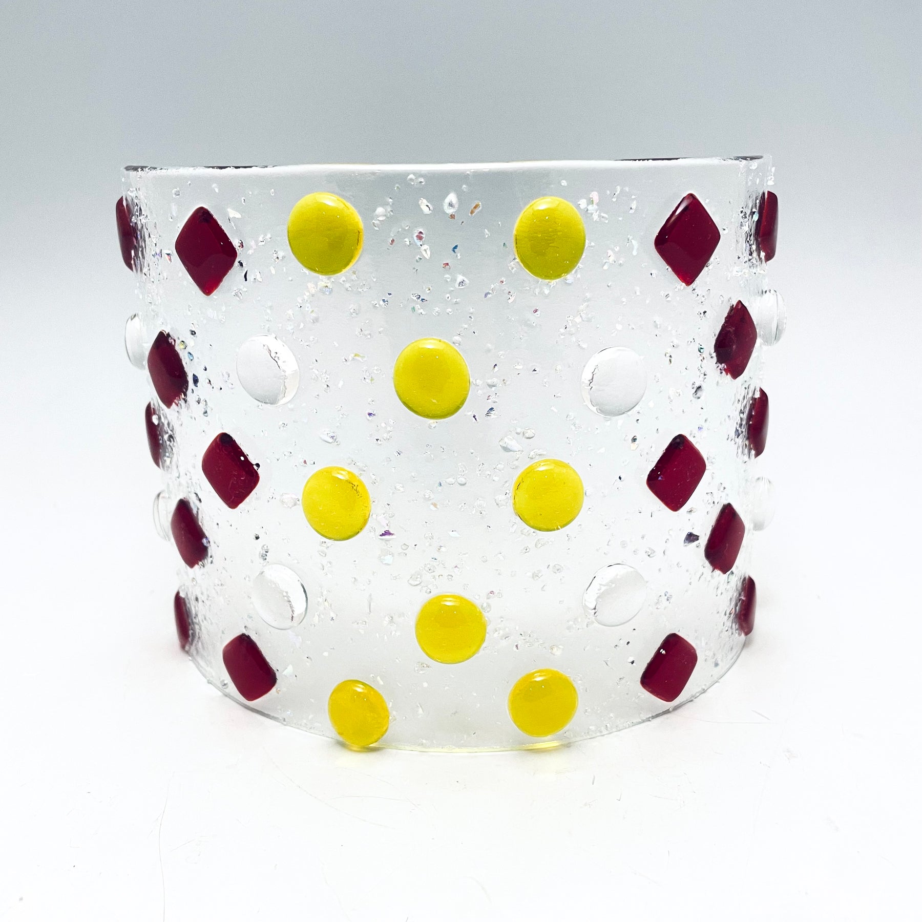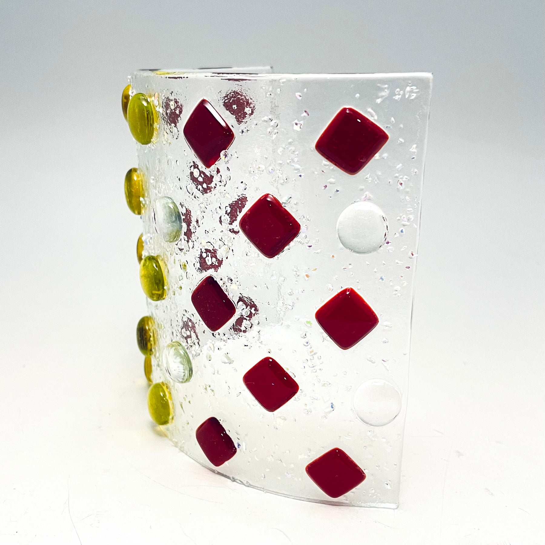 Artistic Process: The glass was cut and put together in a design and fused together.  The final firing was to form the glass into its curved shape with the bottom ground so it stands level and stable.