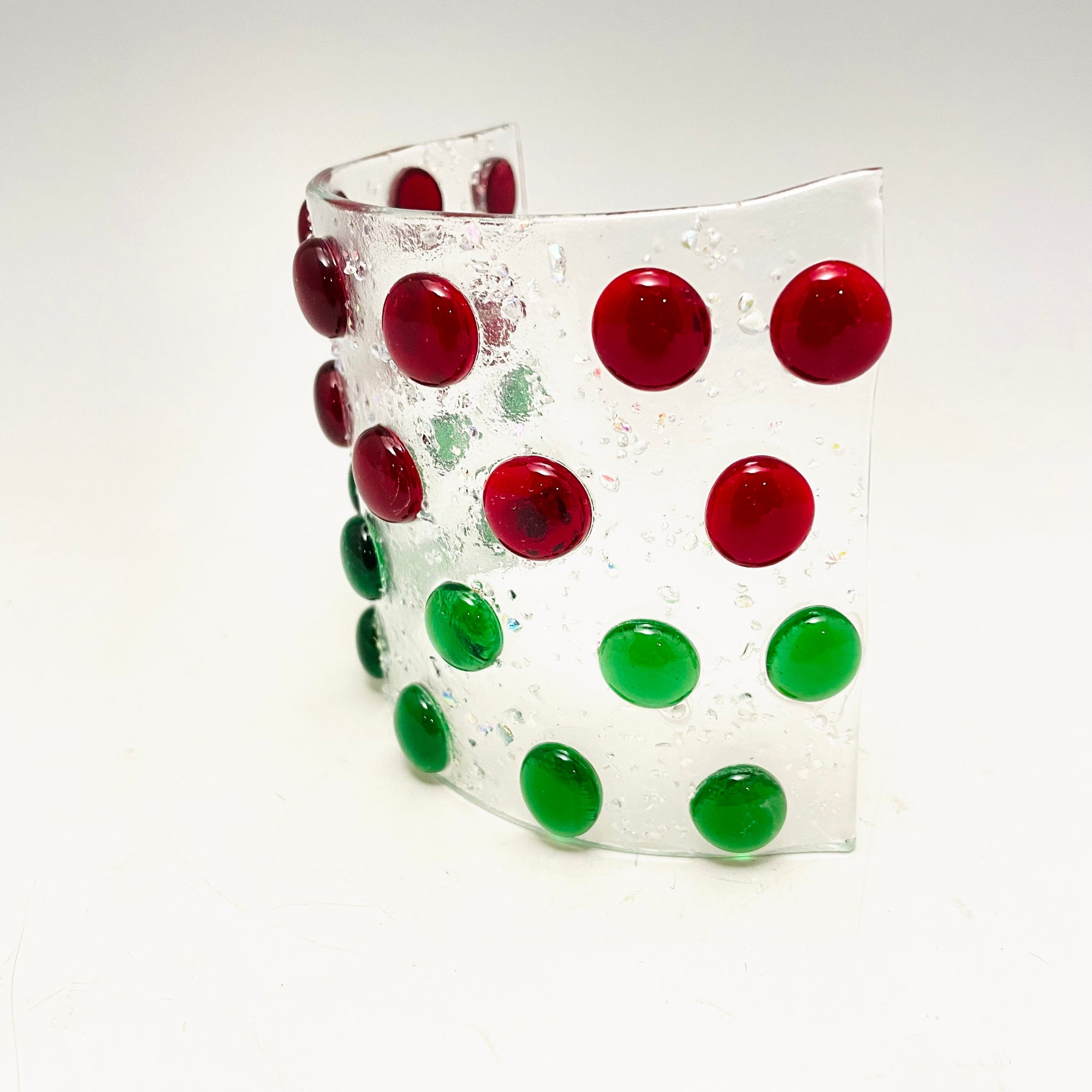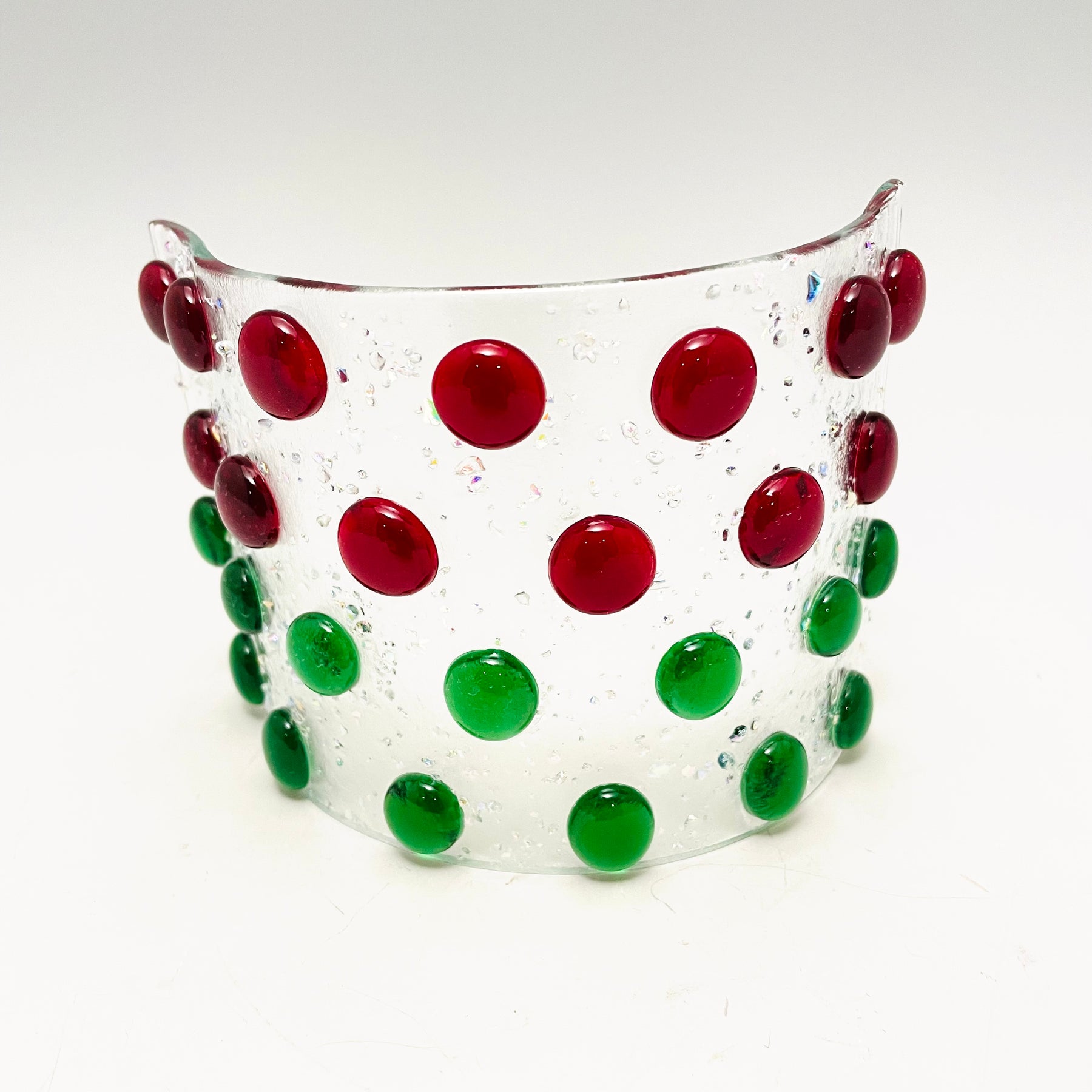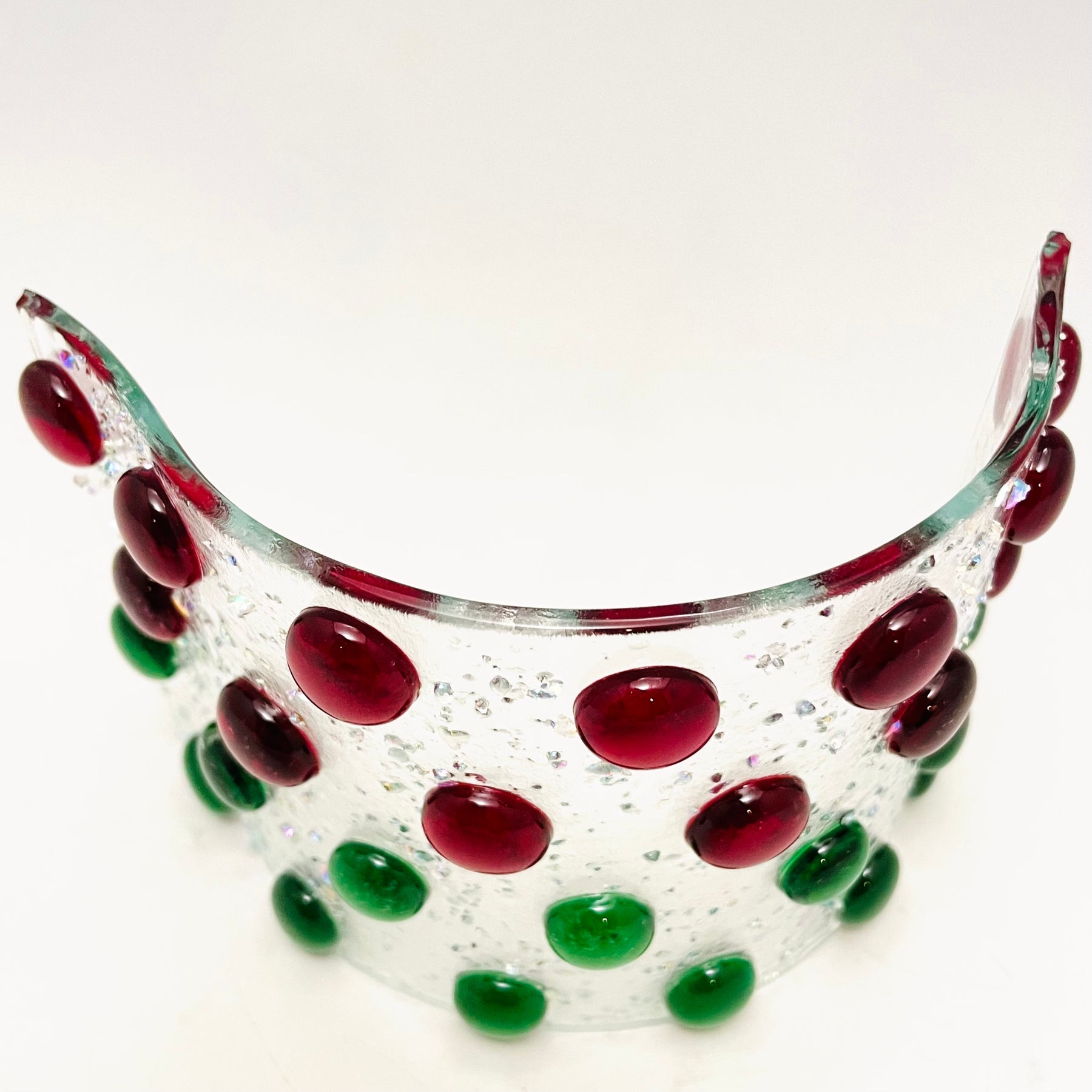 Artistic Process: The glass was cut and put together in a design and fused together. The final firing was to form the glass into its curved shape with the bottom ground so it stands level and stable.