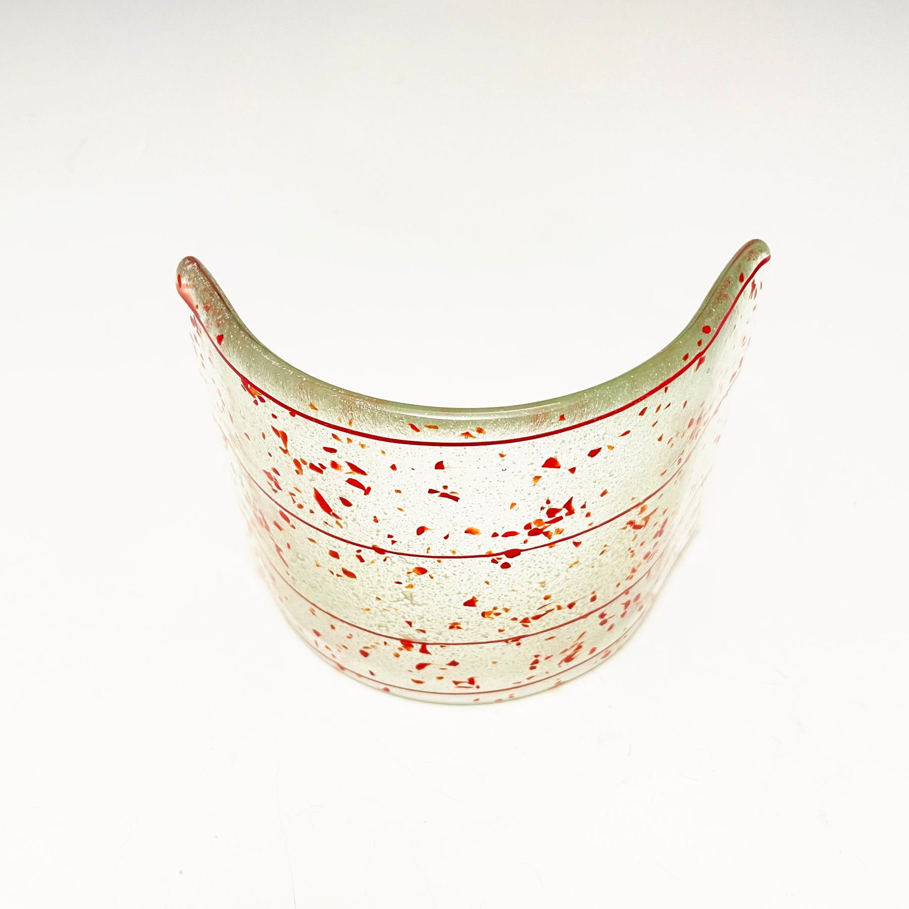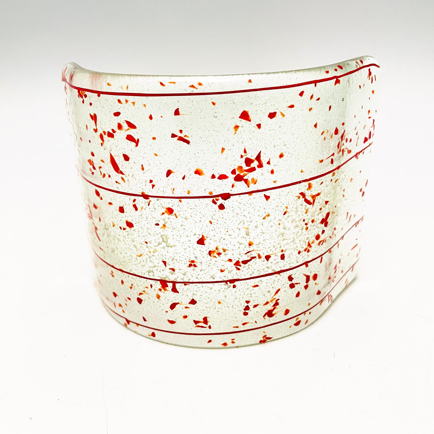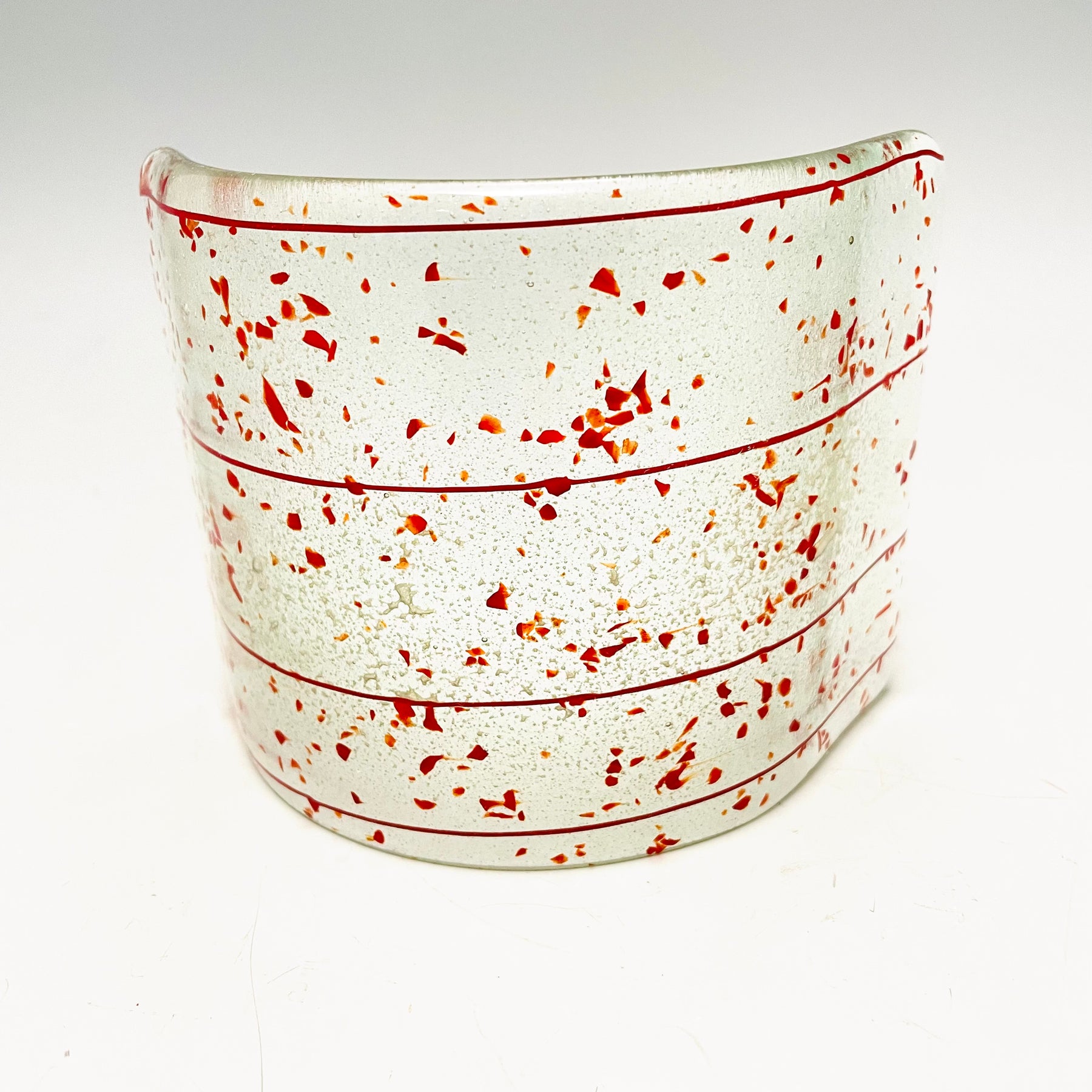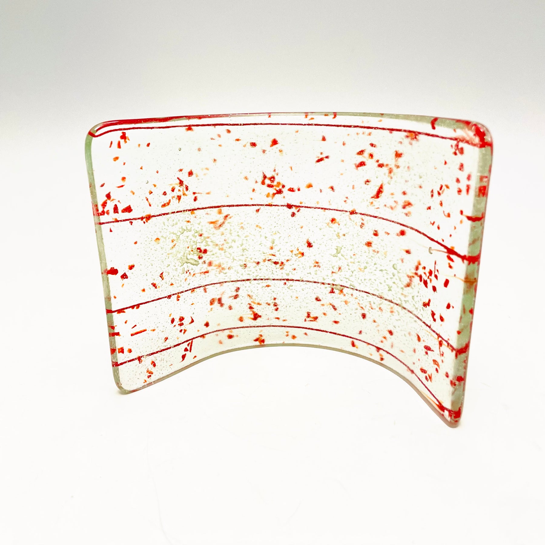 Artistic Process: The glass was cut and put together in a design and fused together.  The final firing was to form the glass into its curved shape with the bottom ground so it stands level and stable.