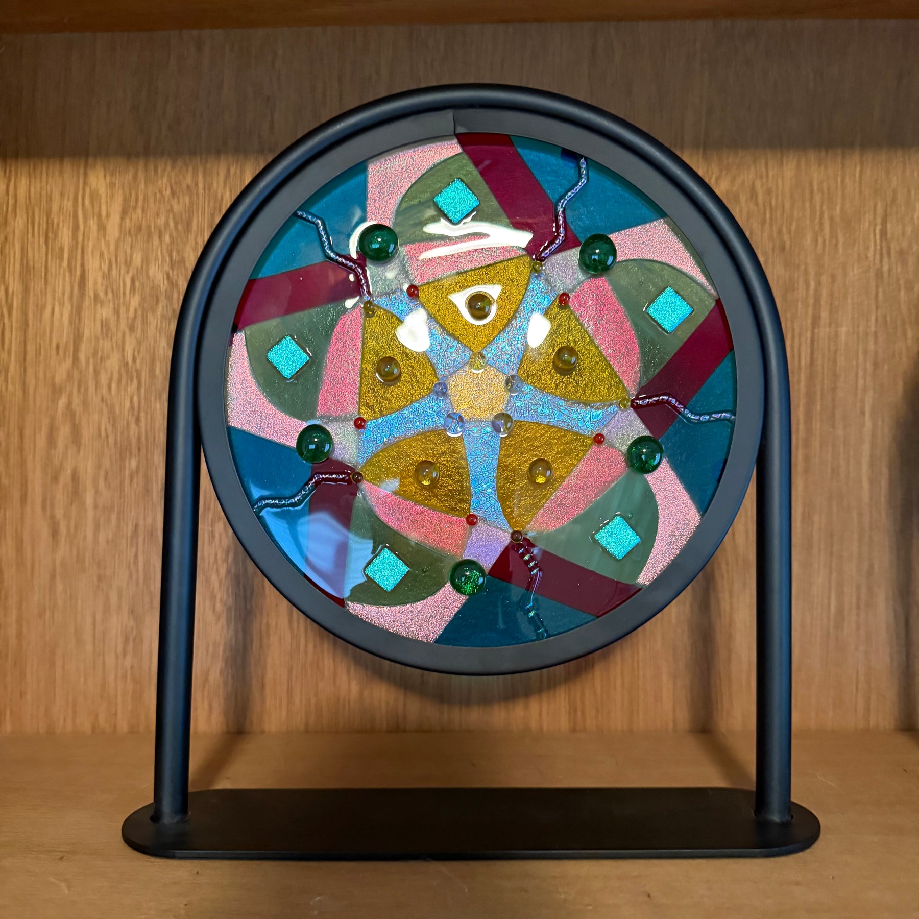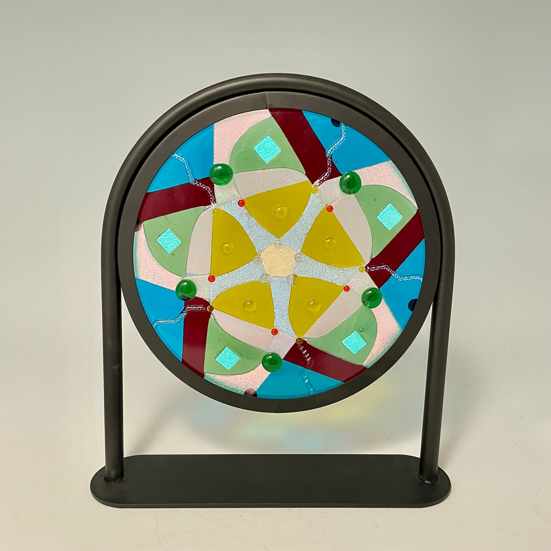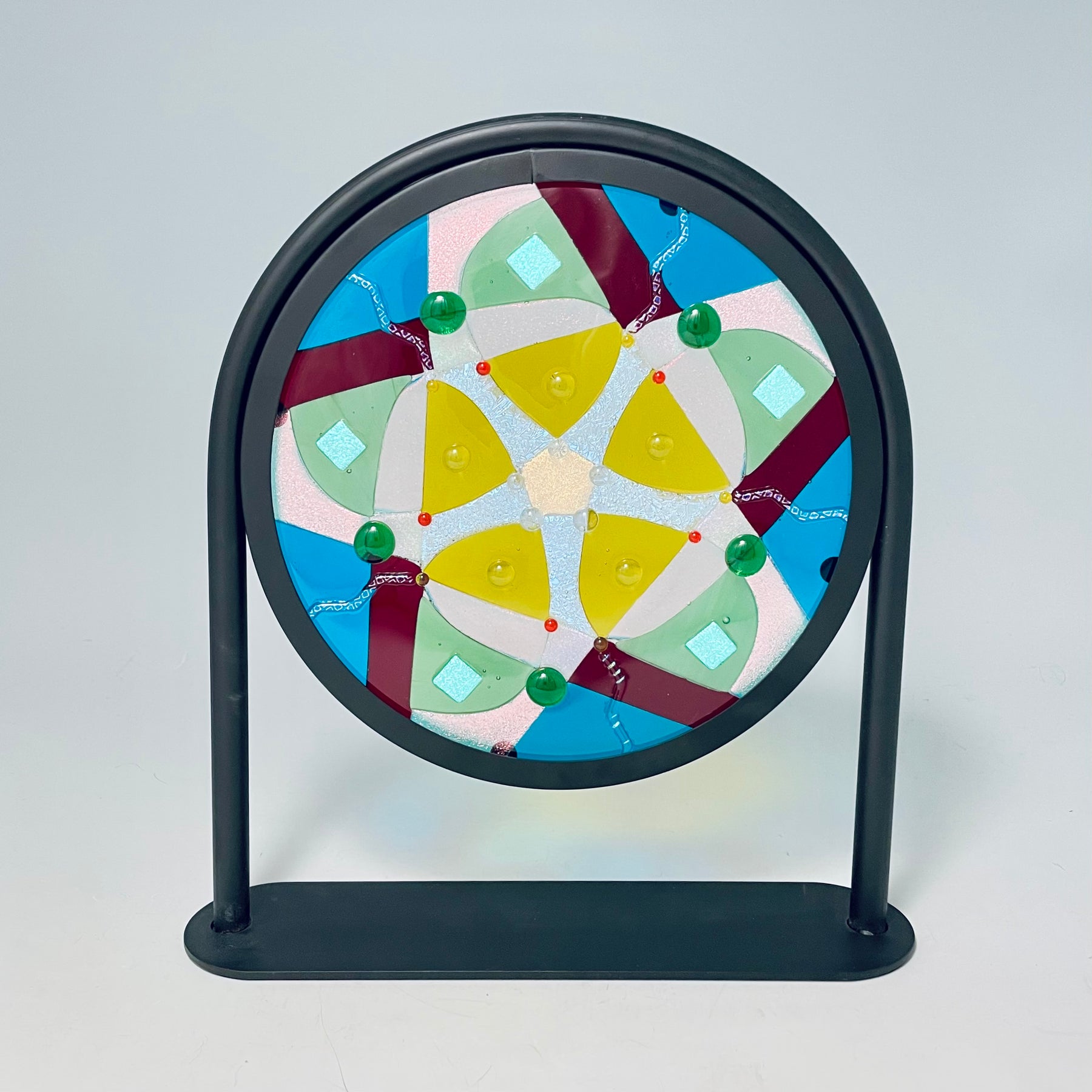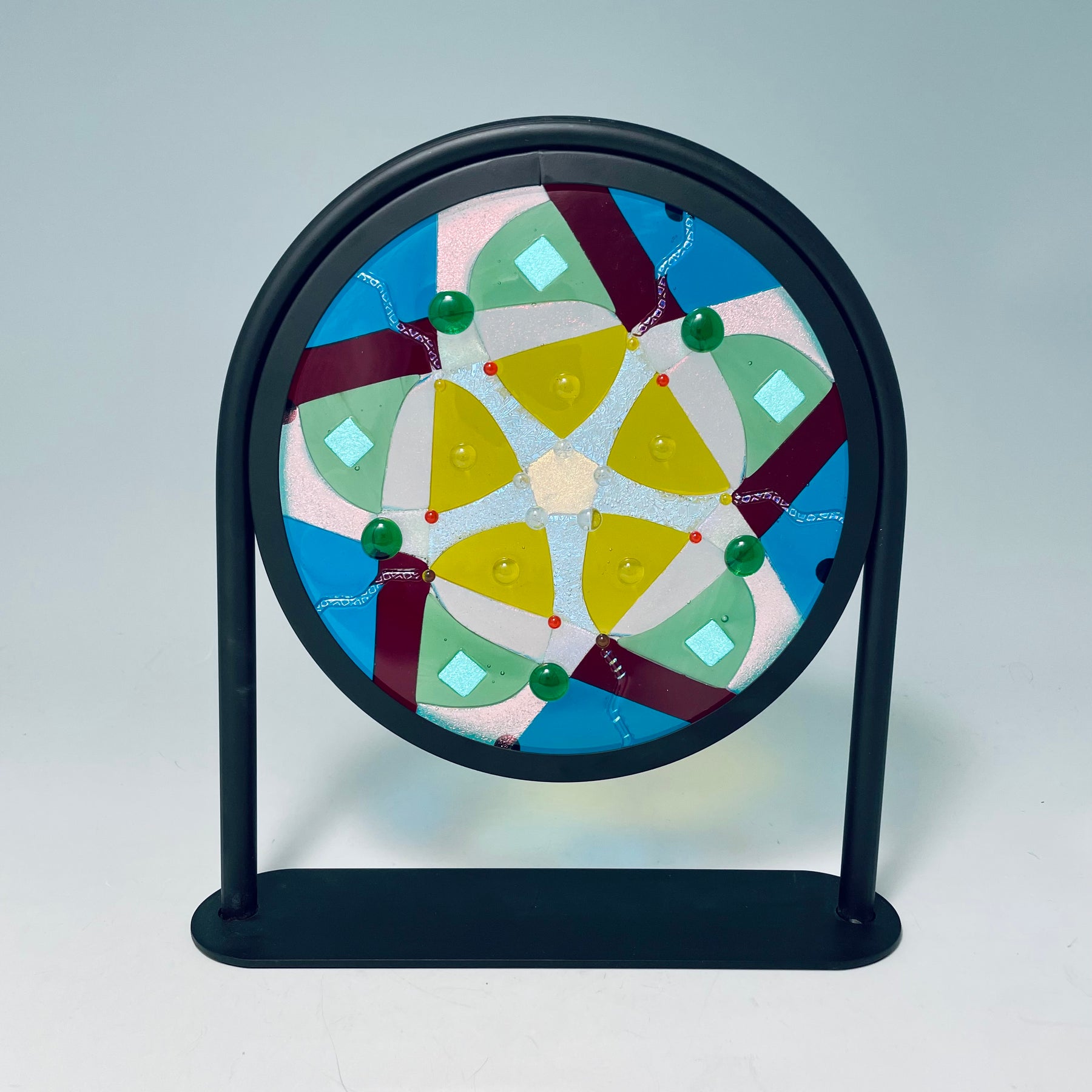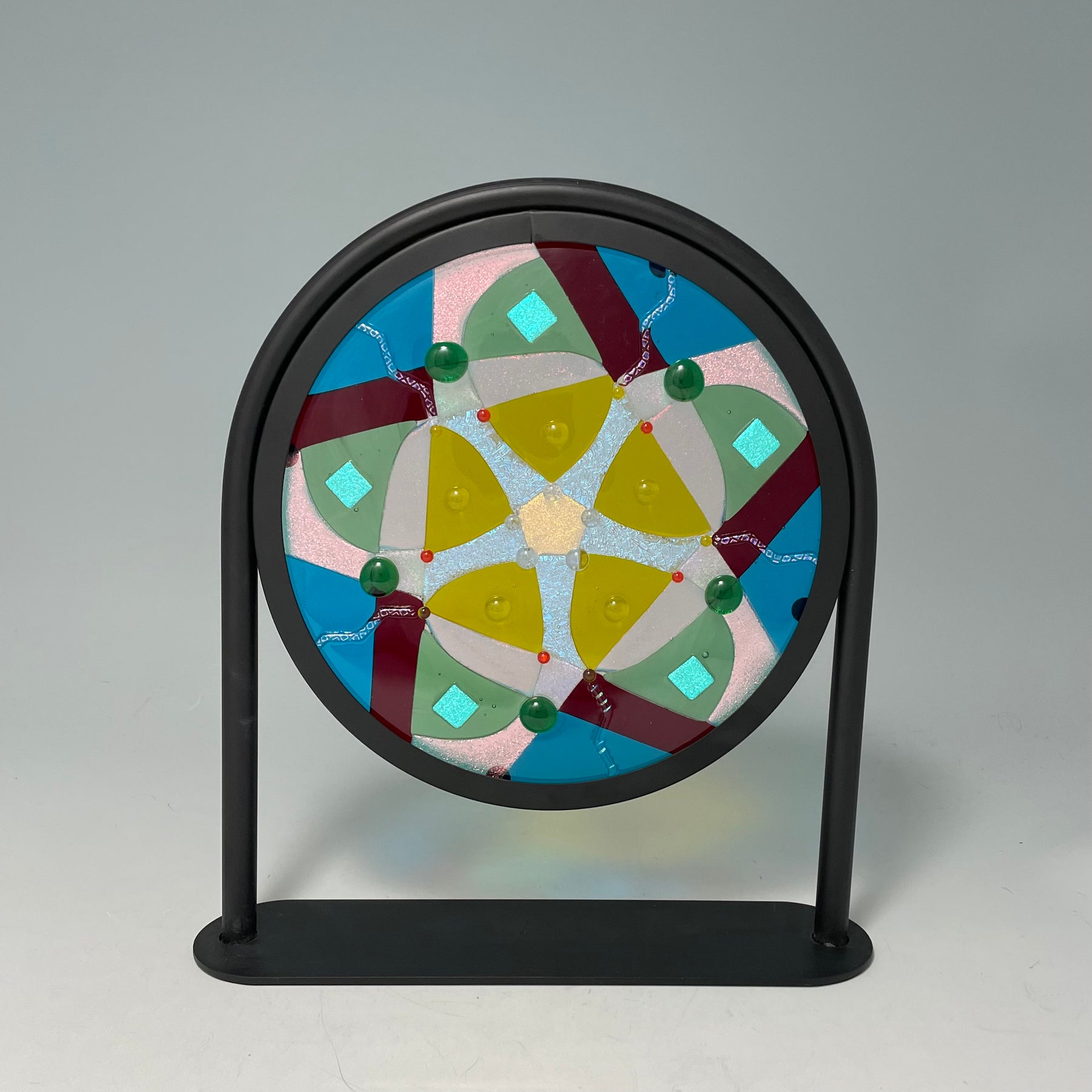 Artistic process:. Hard-Edged Kiln-Fired technique.  Based on a design I sketched, I selected and cut glass into the layout with precise cutting and grinding. After capping with a circle of clear, it was fired to a full fuse. I added embellishments that sparkle and add additional depth and texture.  It was then fired to tack them on creating texture.  It is installed in a black round frame on a stand.