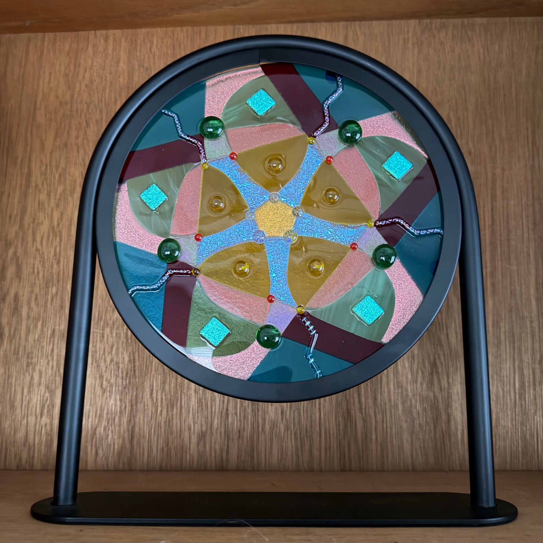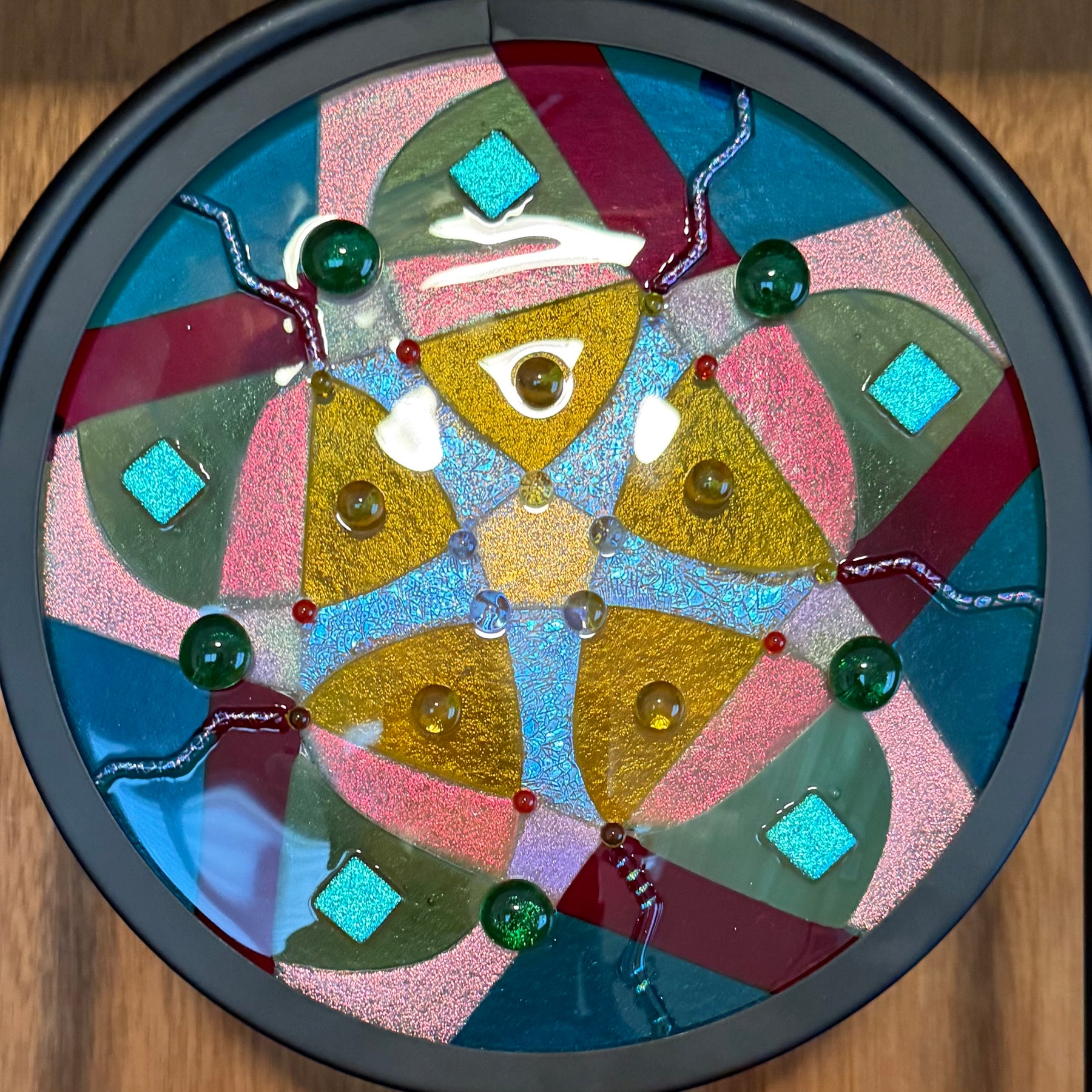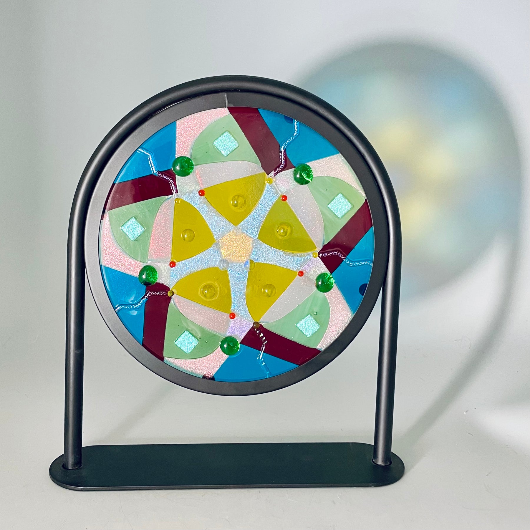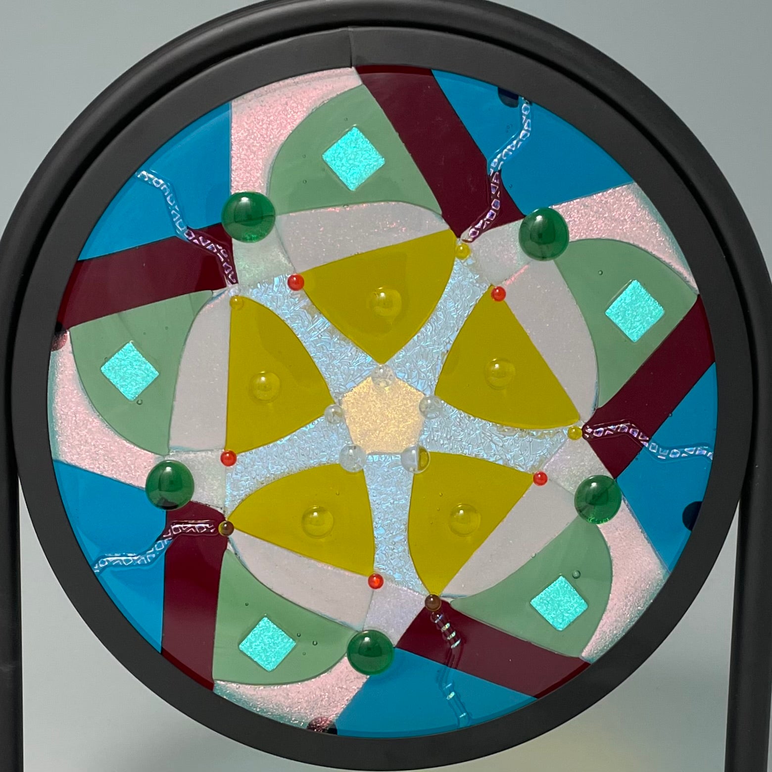 Artistic process:. Hard-Edged Kiln-Fired technique.  Based on a design I sketched, I selected and cut glass into the layout with precise cutting and grinding. After capping with a circle of clear, it was fired to a full fuse. I added embellishments that sparkle and add additional depth and texture.  It was then fired to tack them on creating texture.  It is installed in a black round frame on a stand.