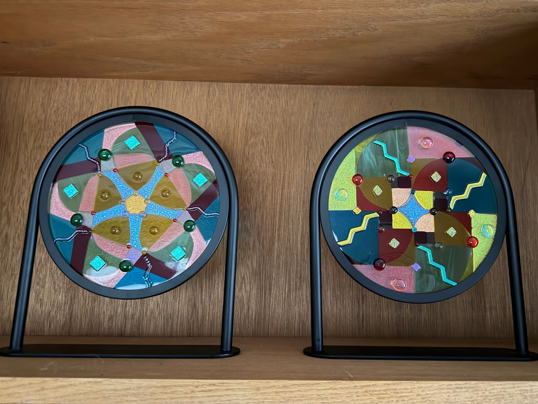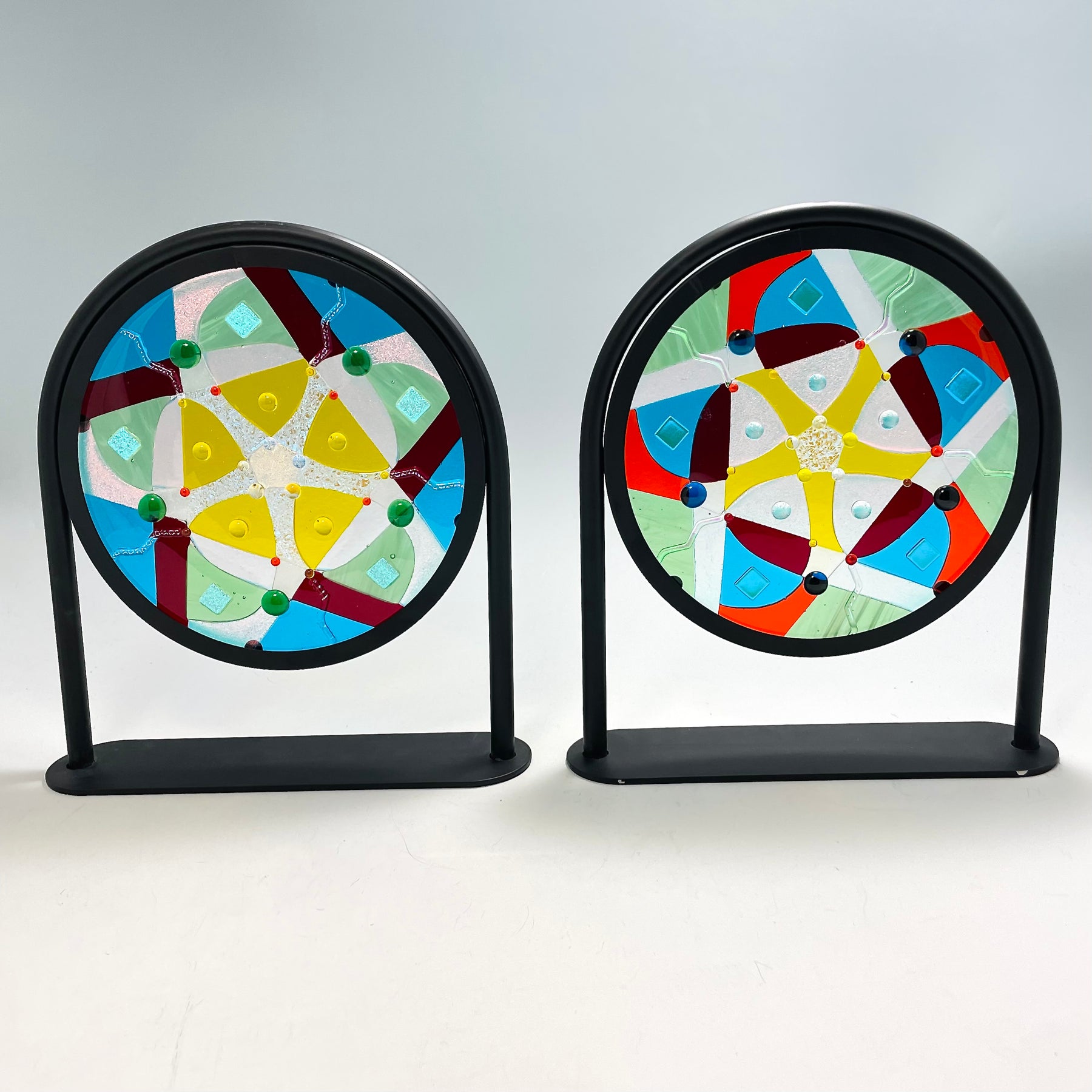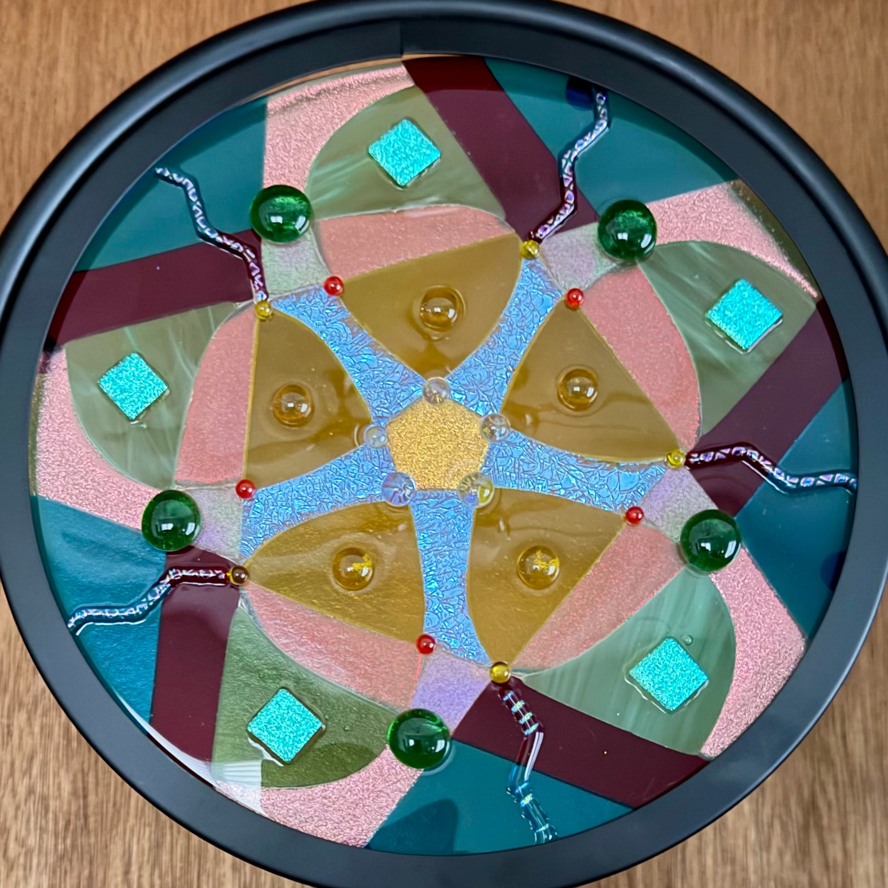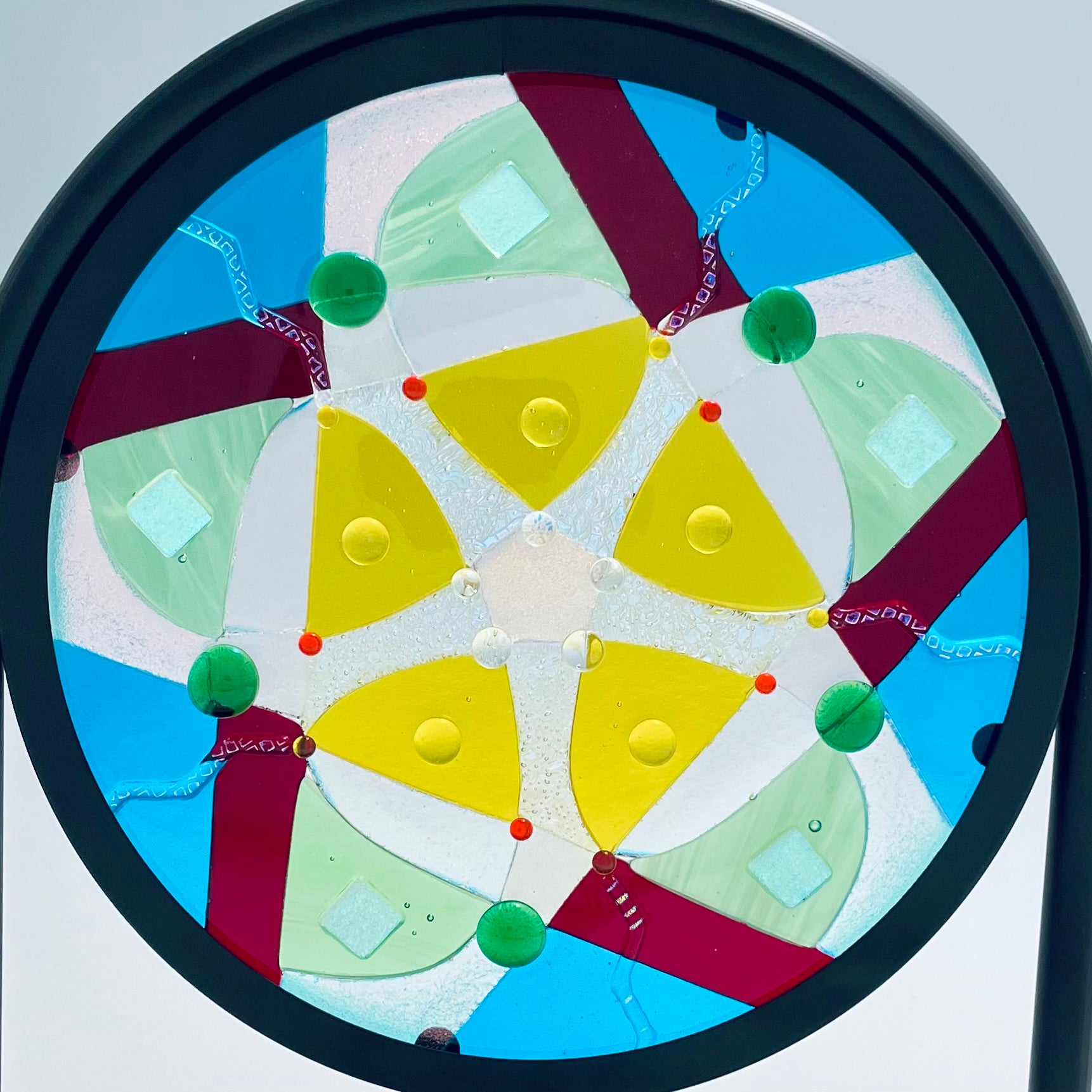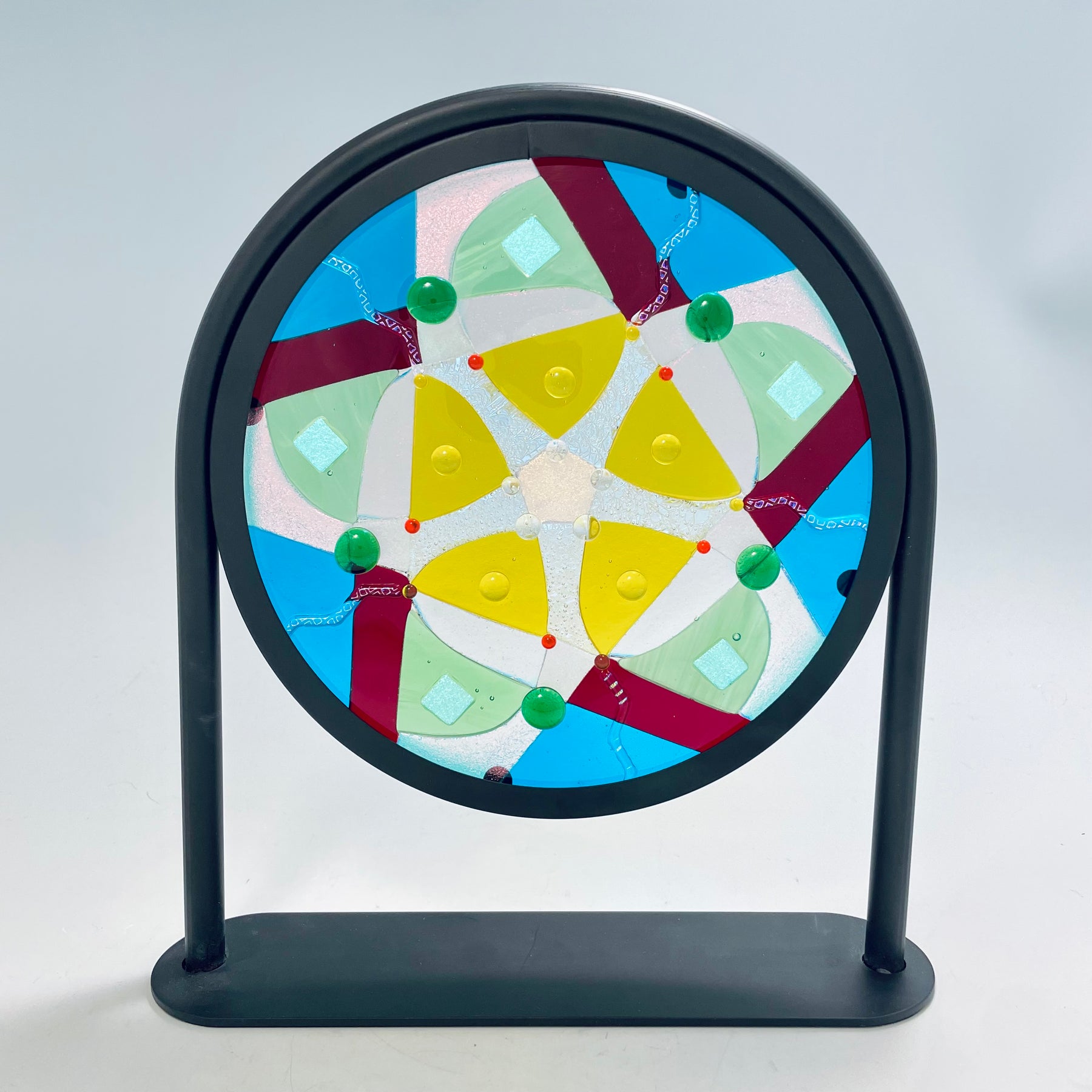 Artistic process:. Hard-Edged Kiln-Fired technique.  Based on a design I sketched, I selected and cut glass into the layout with precise cutting and grinding. After capping with a circle of clear, it was fired to a full fuse. I added embellishments that sparkle and add additional depth and texture.  It was then fired to tack them on creating texture.  It is installed in a black round frame on a stand.