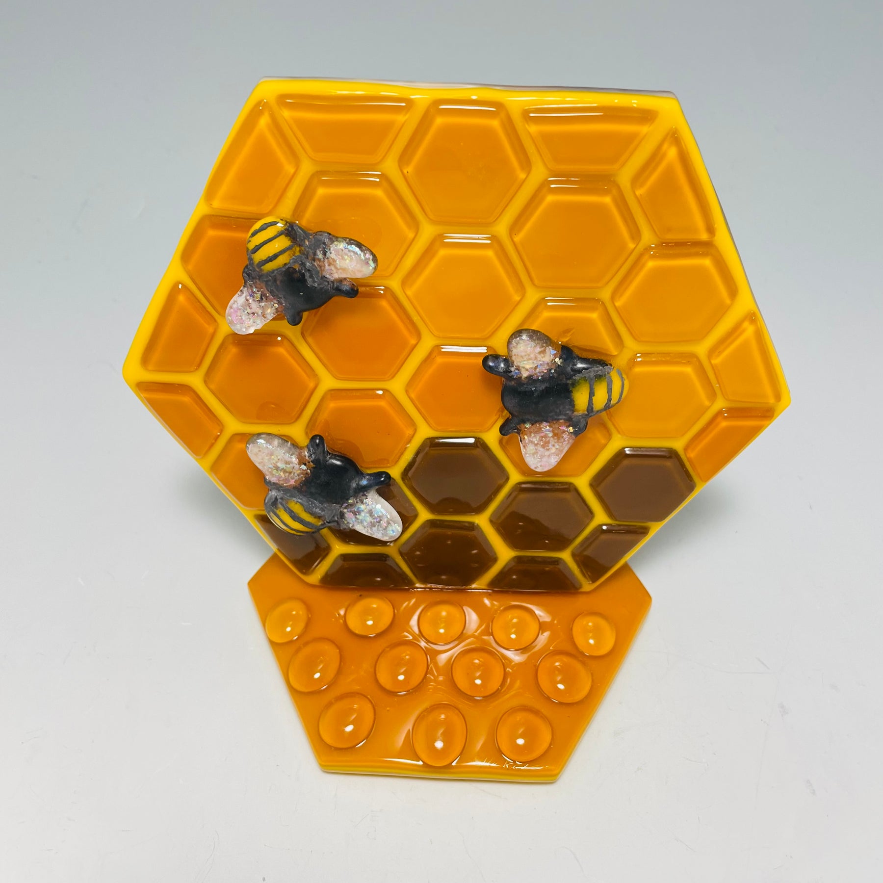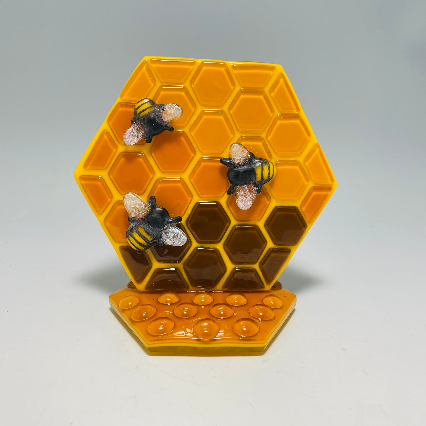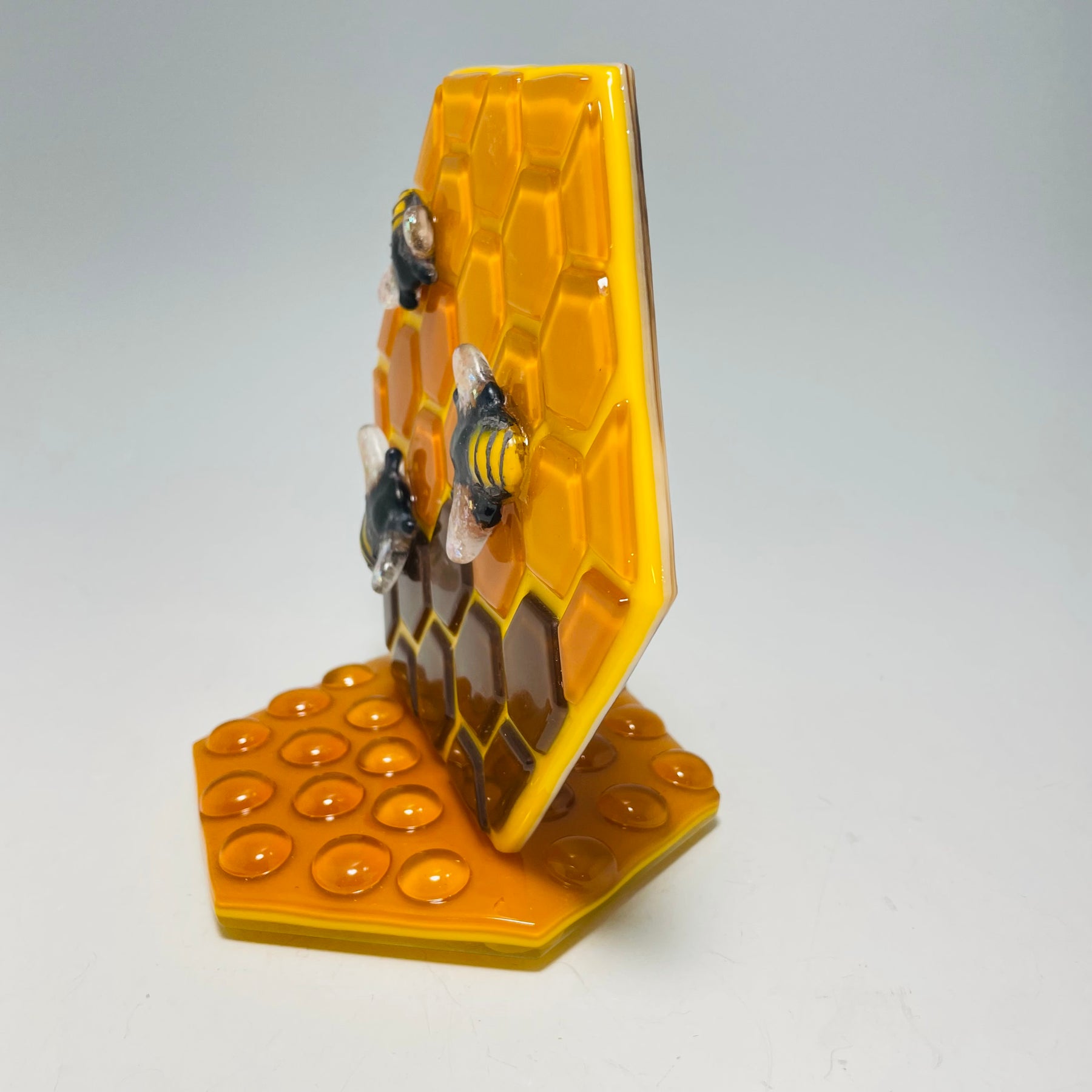 The stands are made of multiple layers of glass cut into a complementary shape to fit the overall design. I made amber glass "hone drops" and added them to the front and back of the stand to create drops of honey.