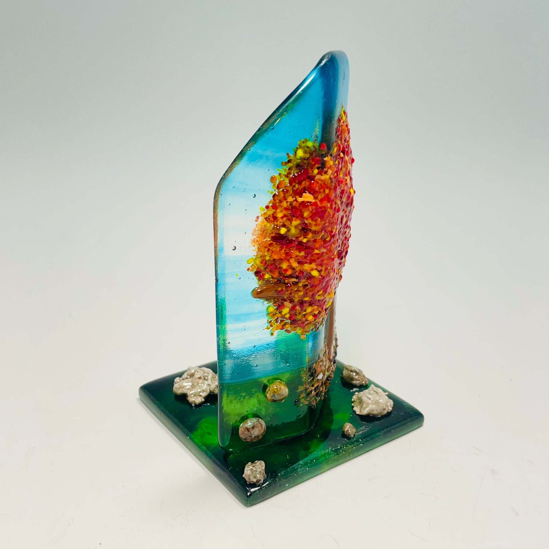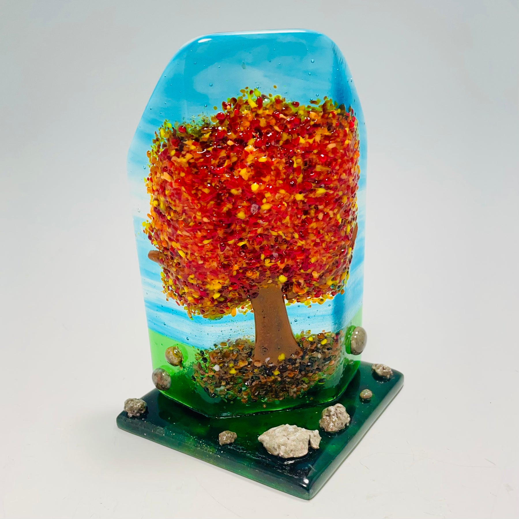 Artistic Process: This tree is made in multiple layers with multiple firing to create depth and dimension then kilnformed into a curve.
