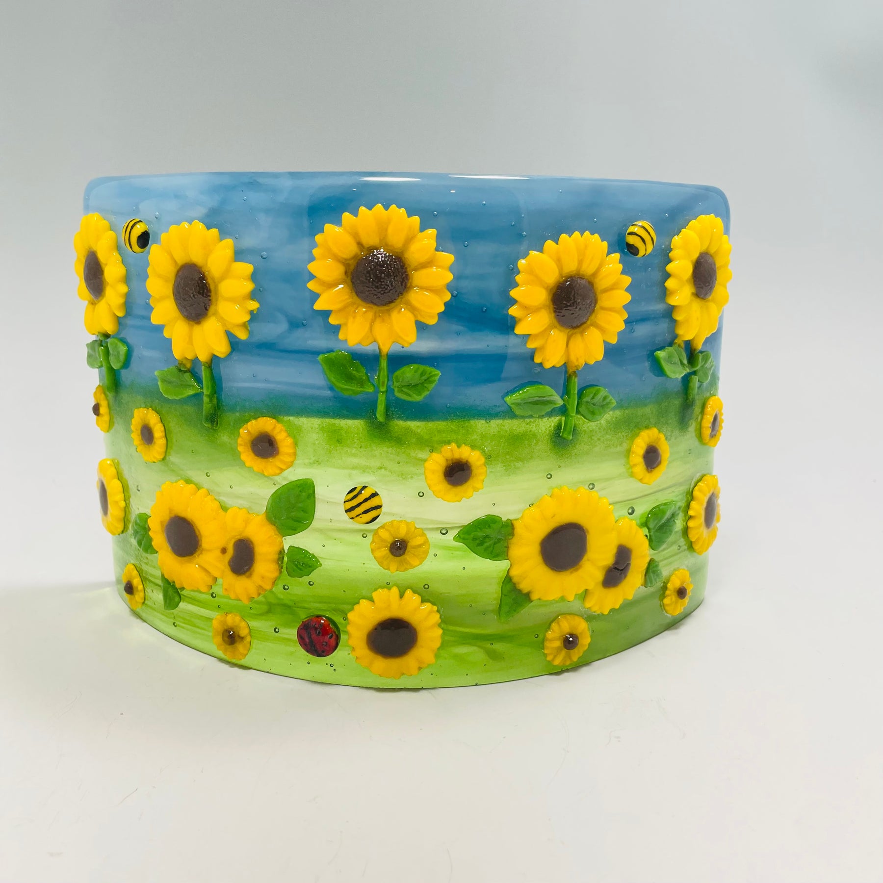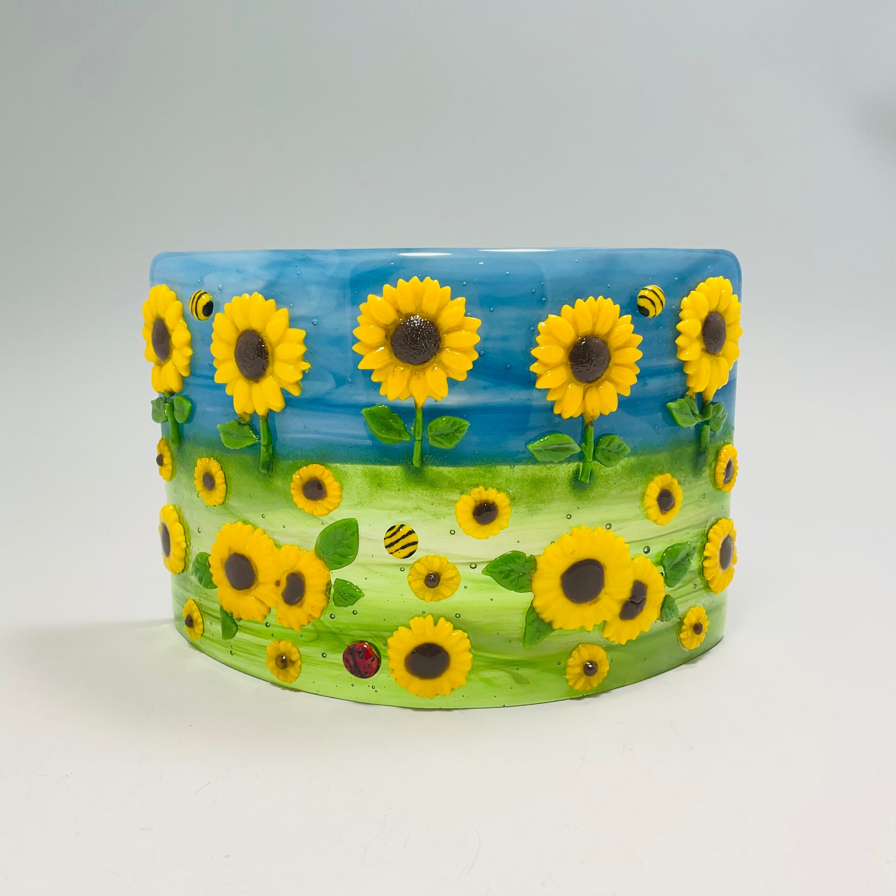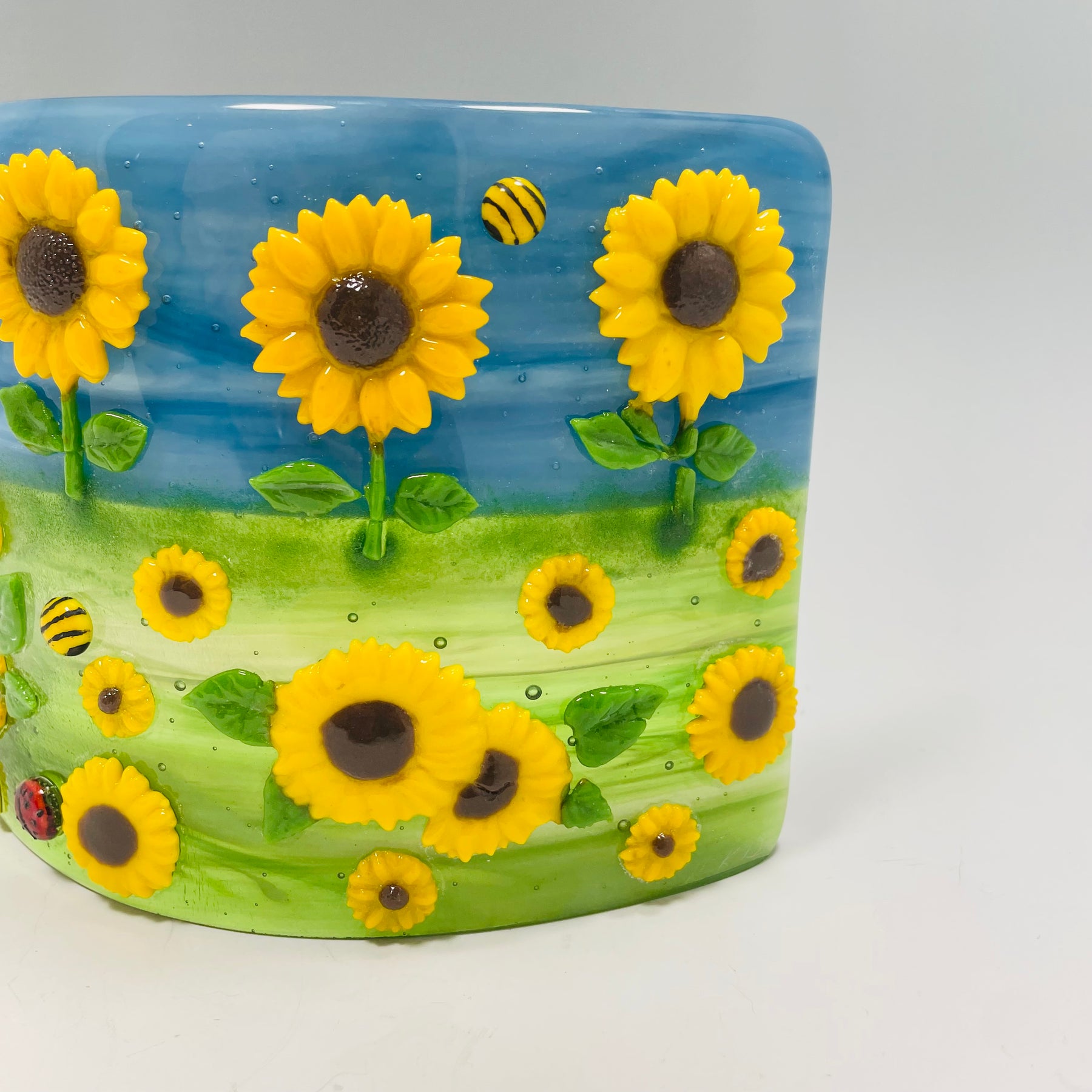 Artistic Process: The background is glass made with with a streaky blue/white swirl for the sky and a swirl blend of greens for the grass with a clear glass on top for more depth in the movement. The sunflowers are casted in a pate de verre technique and then were tack fired to the background along with a small ladybug and bee. The final firing was to form the glass into its curved shape with the bottom ground so it stands level and stable.