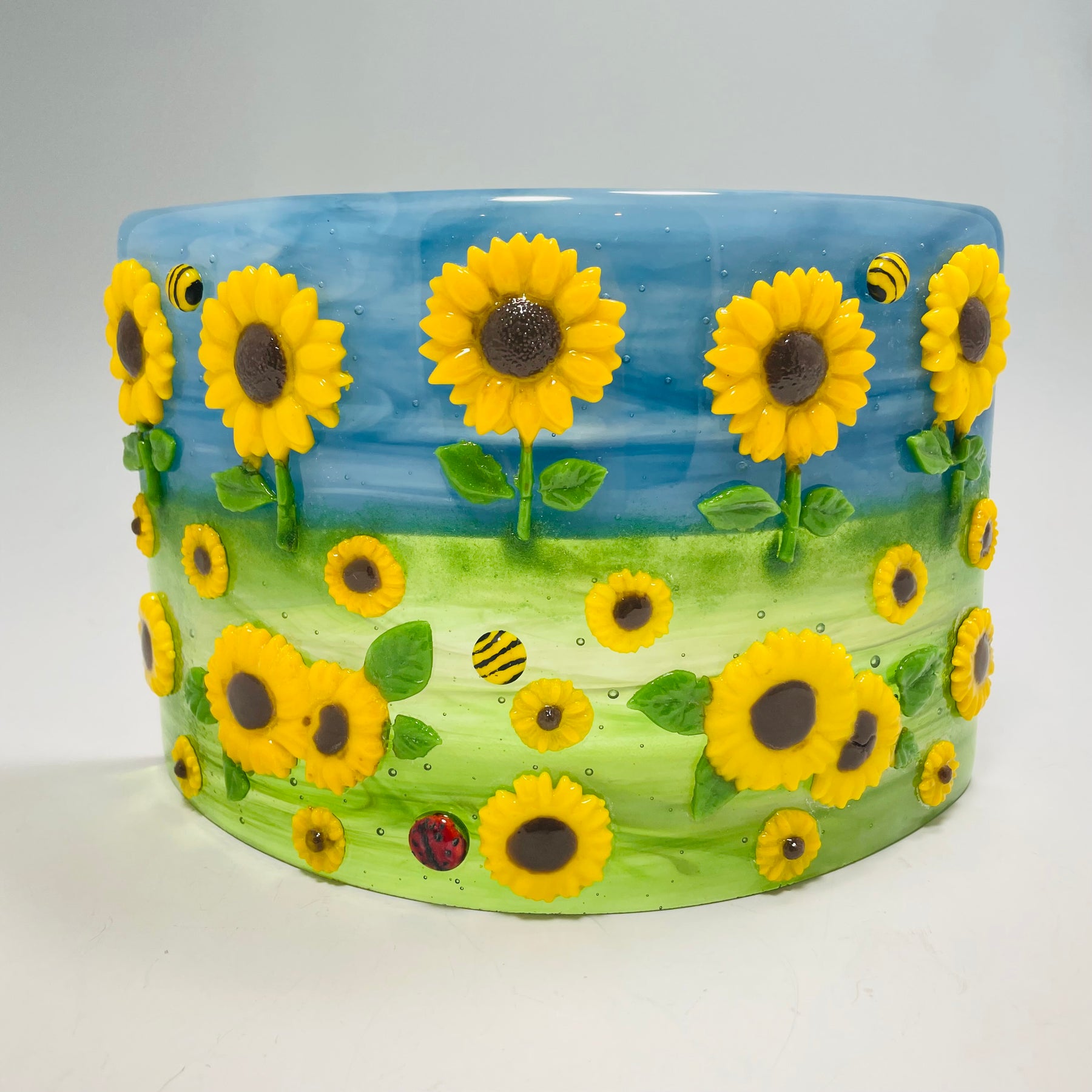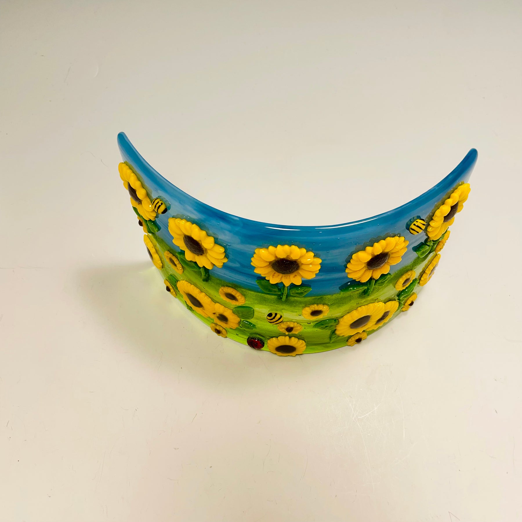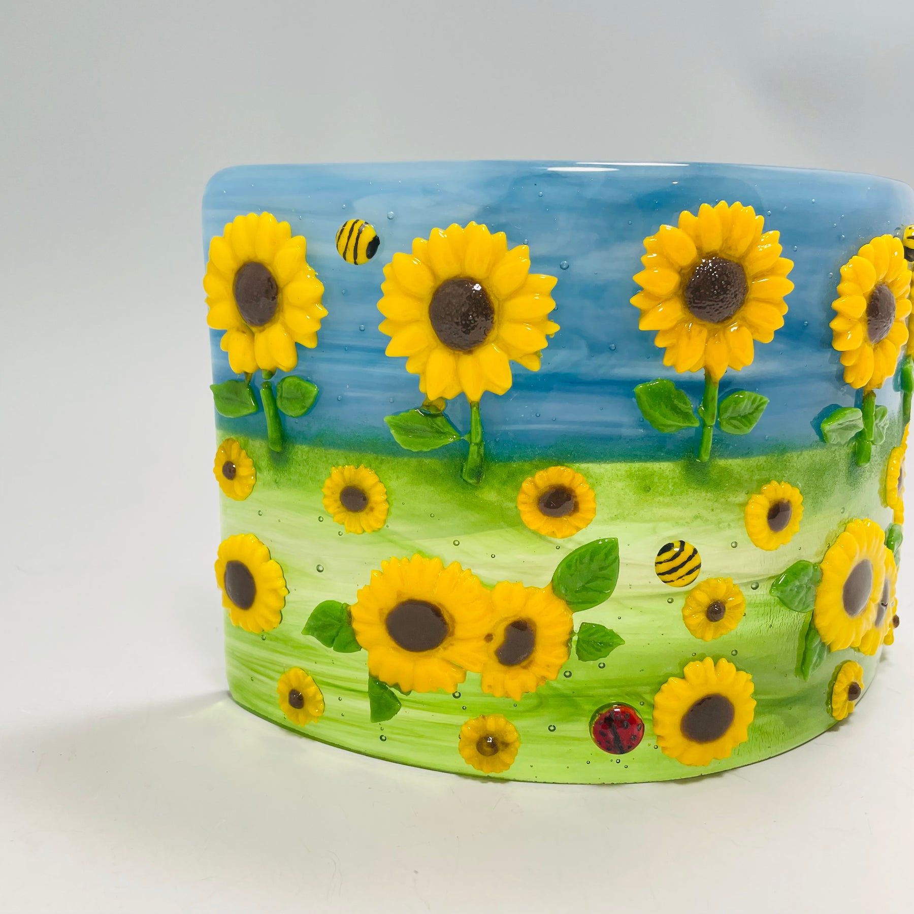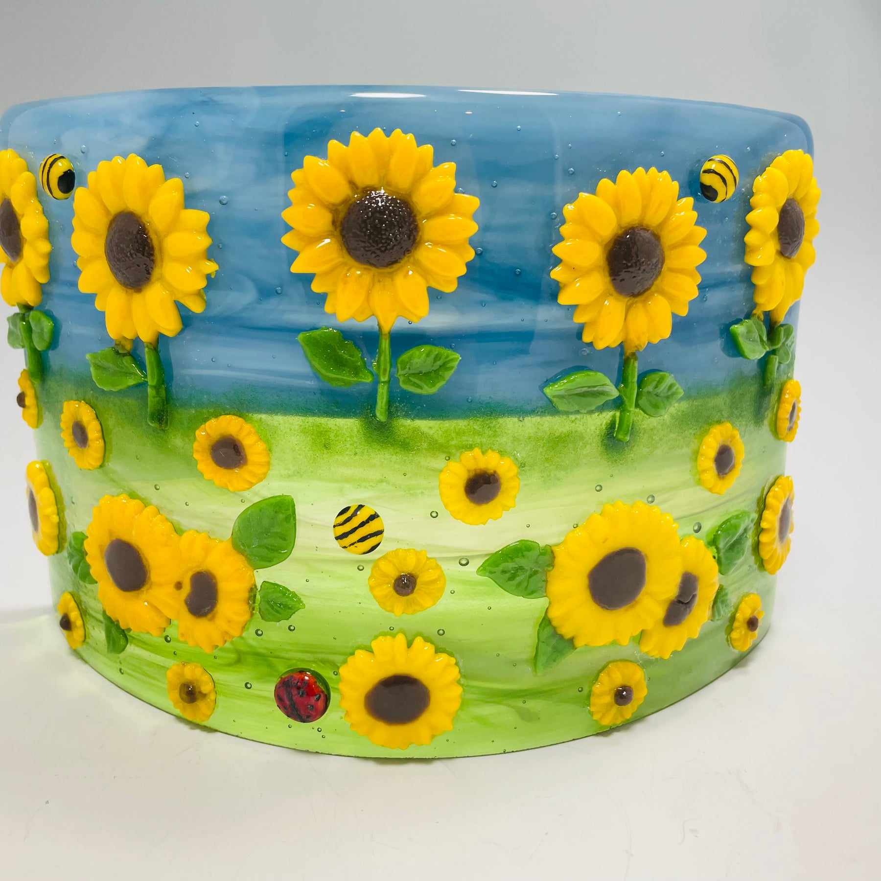 Artistic Process: The background is glass made with with a streaky blue/white swirl for the sky and a swirl blend of greens for the grass with a clear glass on top for more depth in the movement. The sunflowers are casted in a pate de verre technique and then were tack fired to the background along with a small ladybug and bee. The final firing was to form the glass into its curved shape with the bottom ground so it stands level and stable.