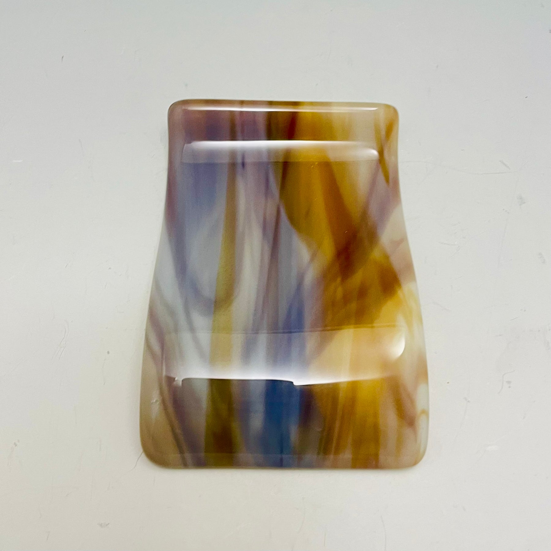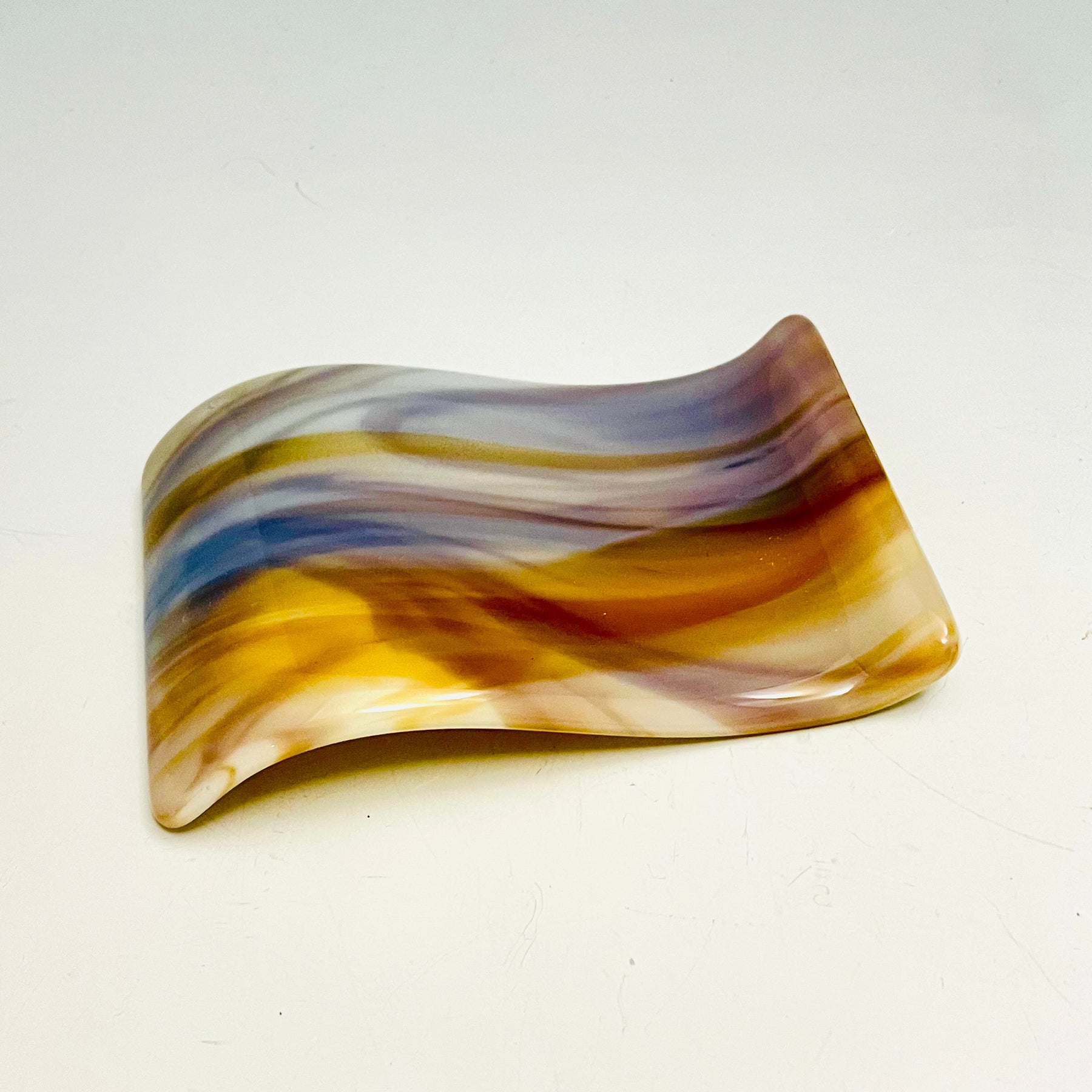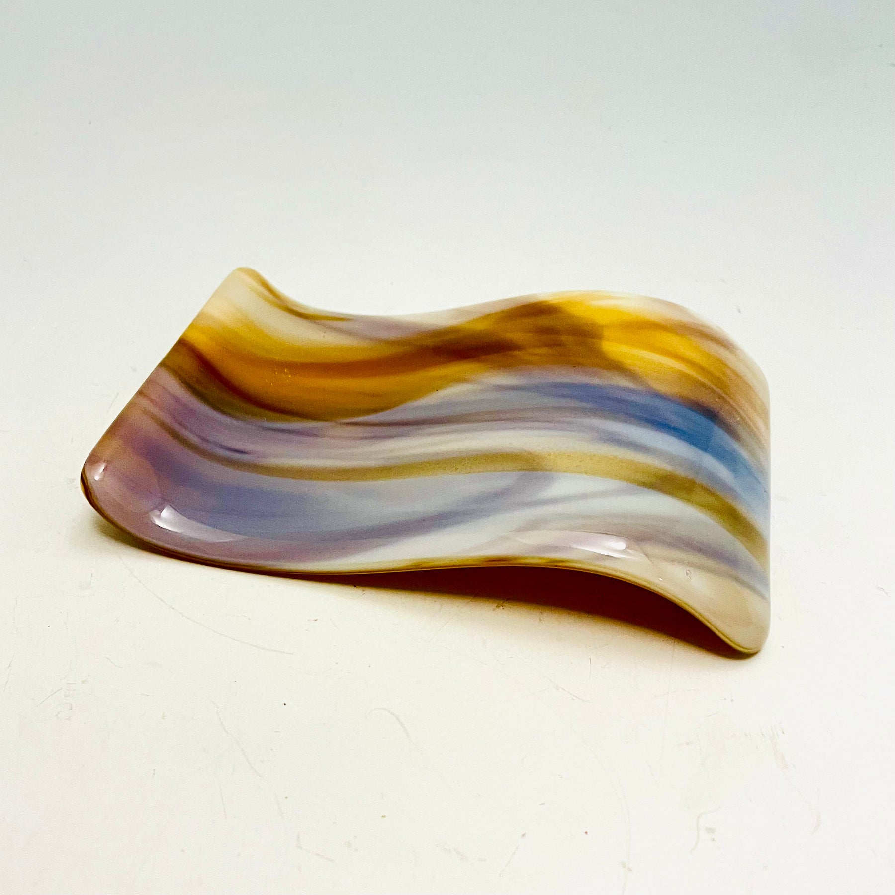 Artistic Process: It is made of hand cut glass in a layout to create a flow and pattern for a full fuse, after coldworking, the glass is firepolished.  The last step is to slump into a ceramic mold to achieve its final shape.  the bottom is perfectly flat and smooth.