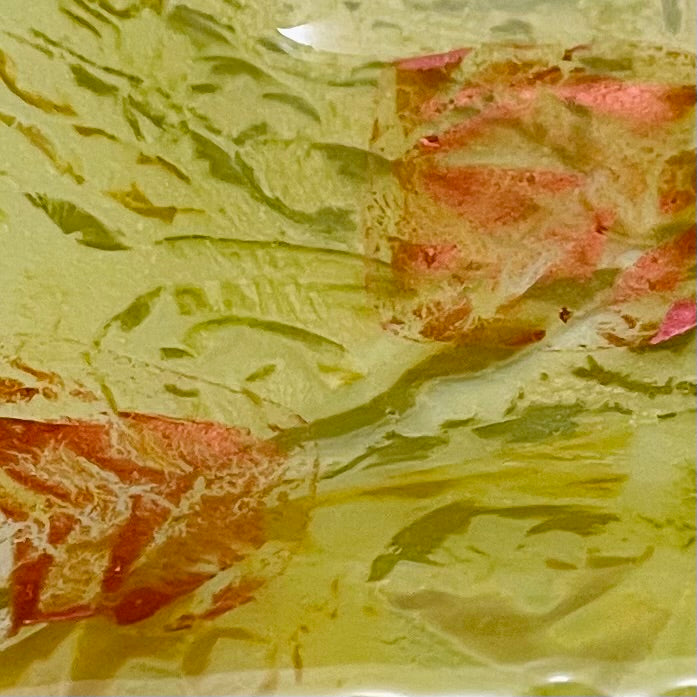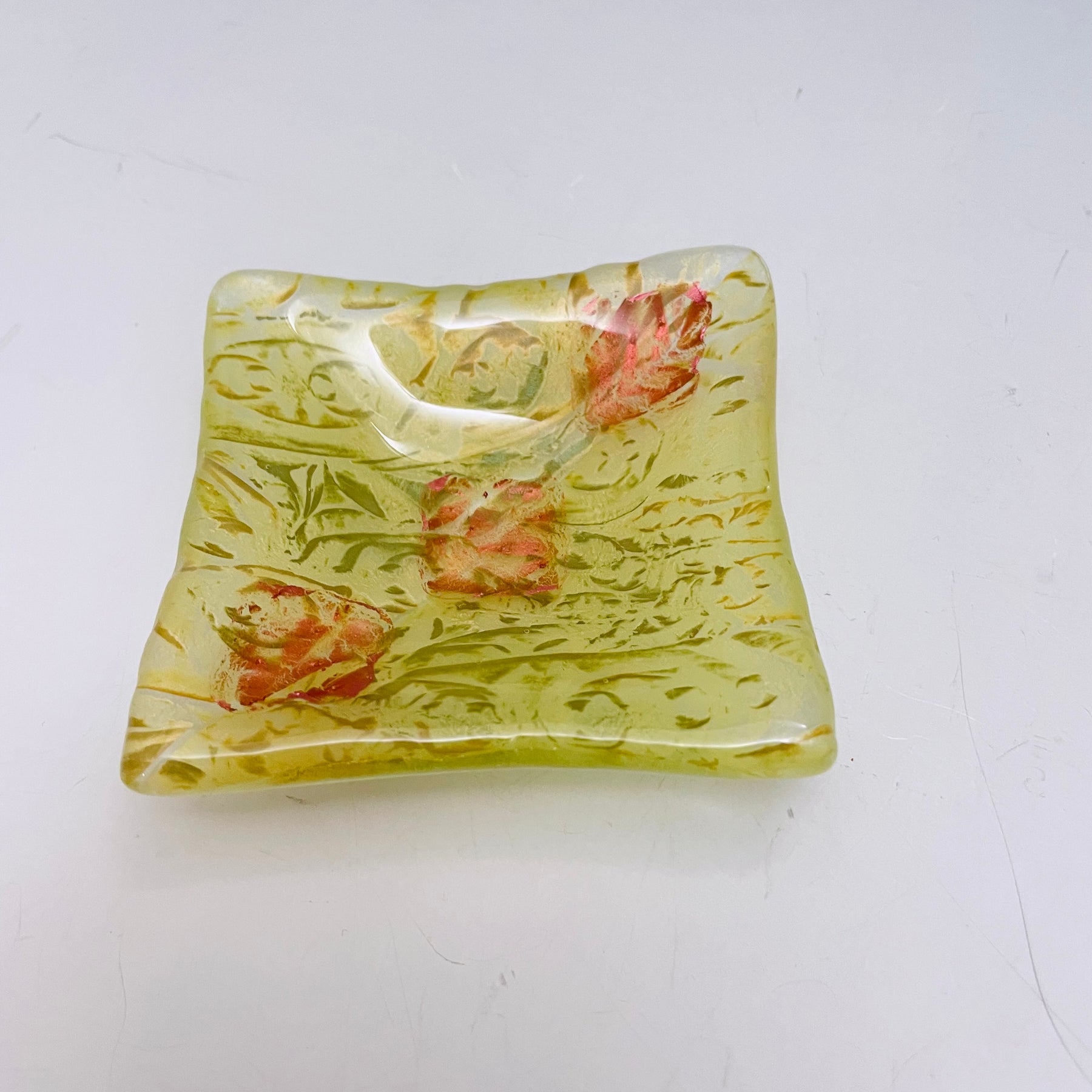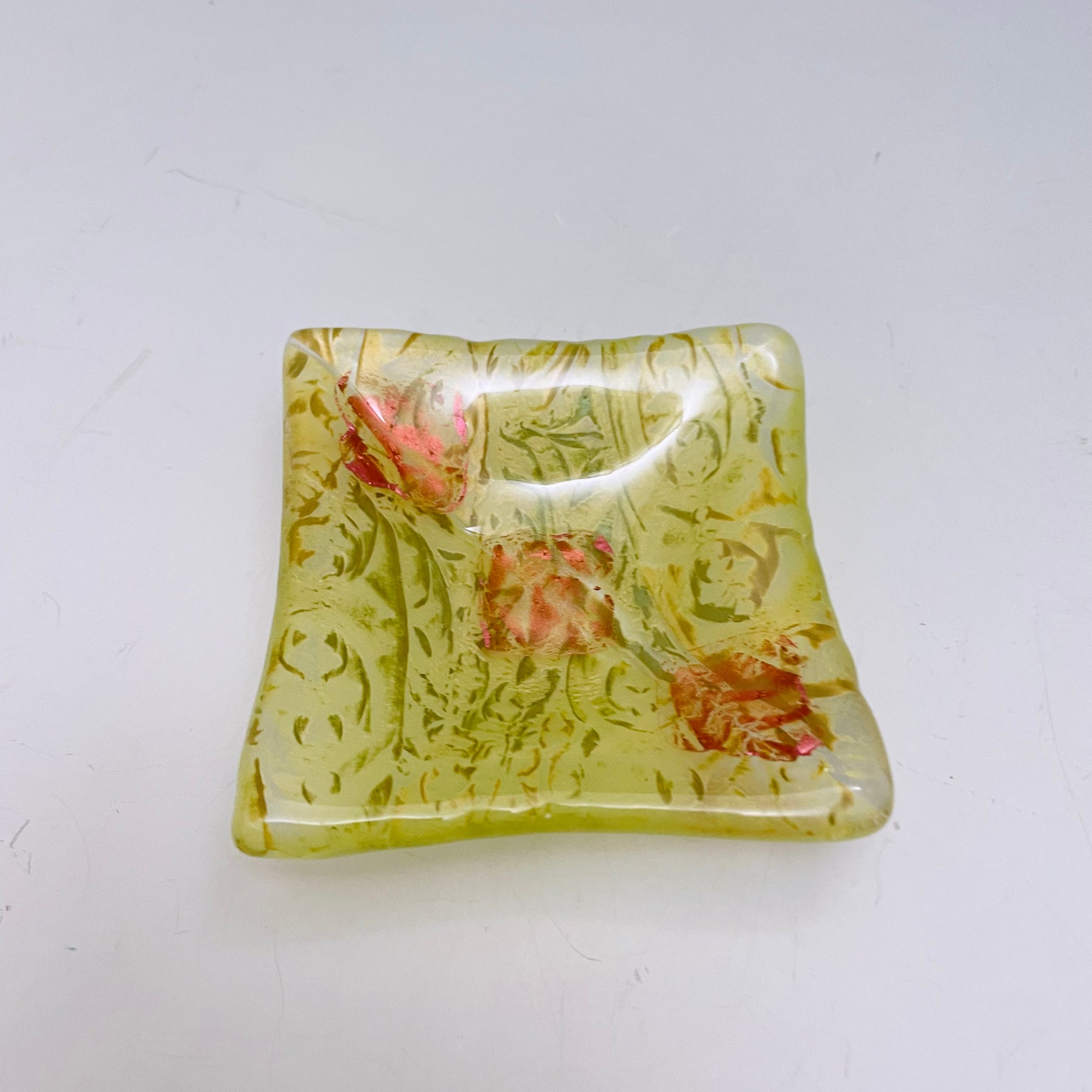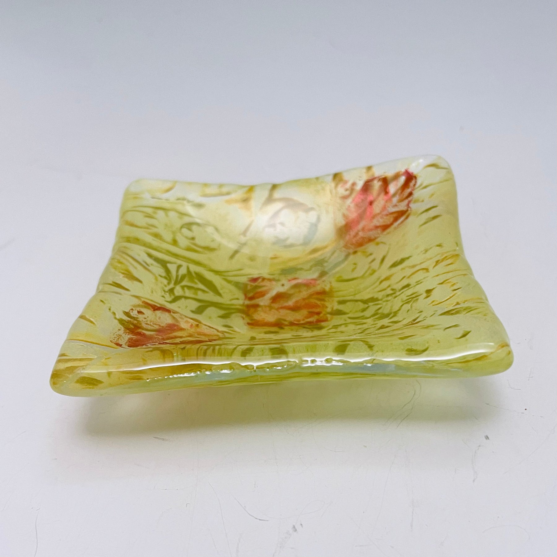 Glass trinket dish with beautiful colors in an interesting design.   It is the perfect size for many little things such as rings, coins, jewelry, or other items.  Its also perfect to hold a teabag or use as a condiment server.  Versatile and food safe.