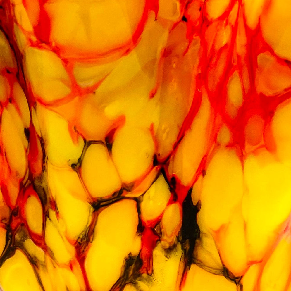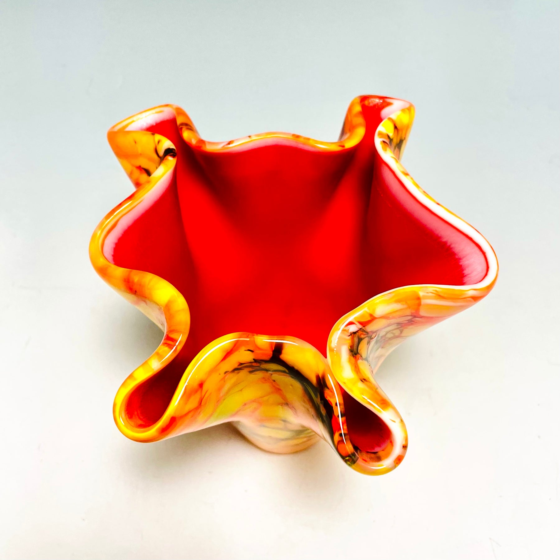 The artistic process:The first step was cutting multiple layers of different glasses with shards of glass on top in a specific pattern inside a stainless steel round mold as a dam to contain the glass. Using a specific program to ramp up and hold the heat in the kiln to spread and stretch the glass to create a unique design. After coldworking the edges, I then added white and orange transparent on the bottom with a clear on top and stretch out the design with heat in the kiln creating a gorgeous orange for the inside.